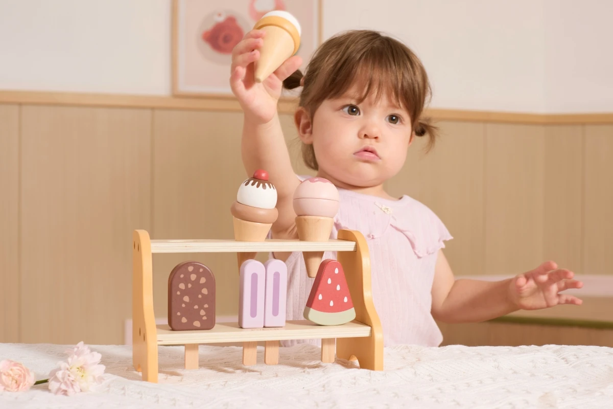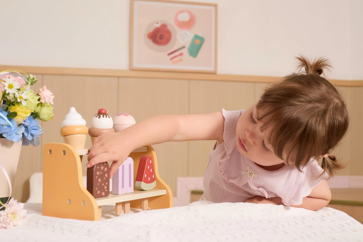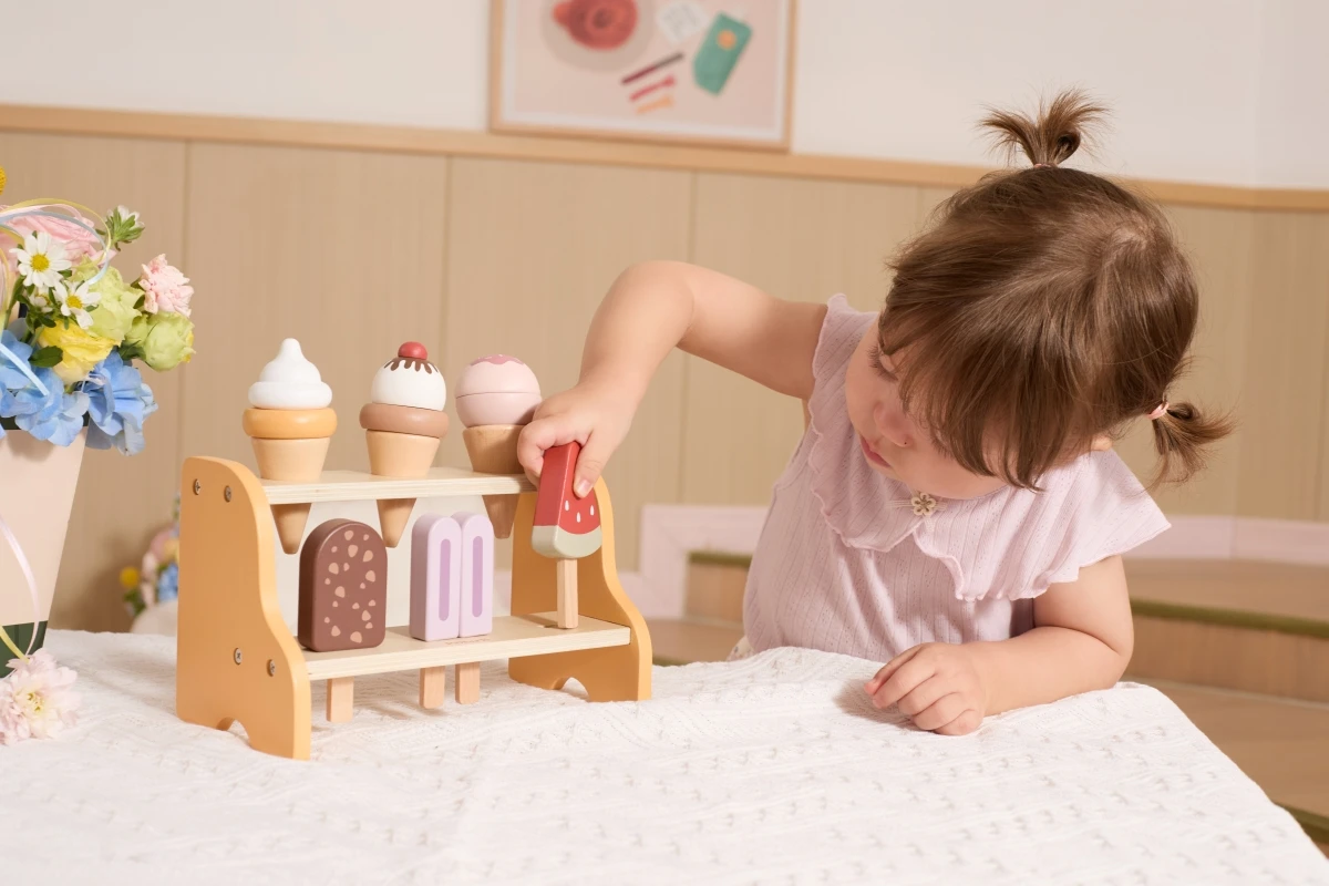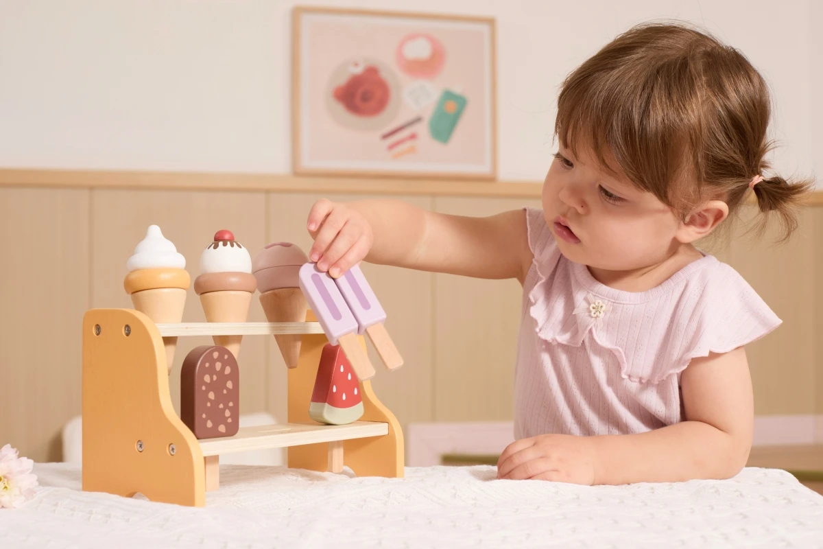 Hra so zmrzlinami rozvíja jemnú motoriku, koordináciu rúk a očí i sociálne zručnosti pri spoločnej hre s rodičmi alebo súrodencami. Vďaka pevnému drevenému prevedeniu je sada odolná a prispôsobená malým detským rúčkam. Držiak umožňuje ľahké ukladanie jednotlivých kúskov a učí deti poriadku.