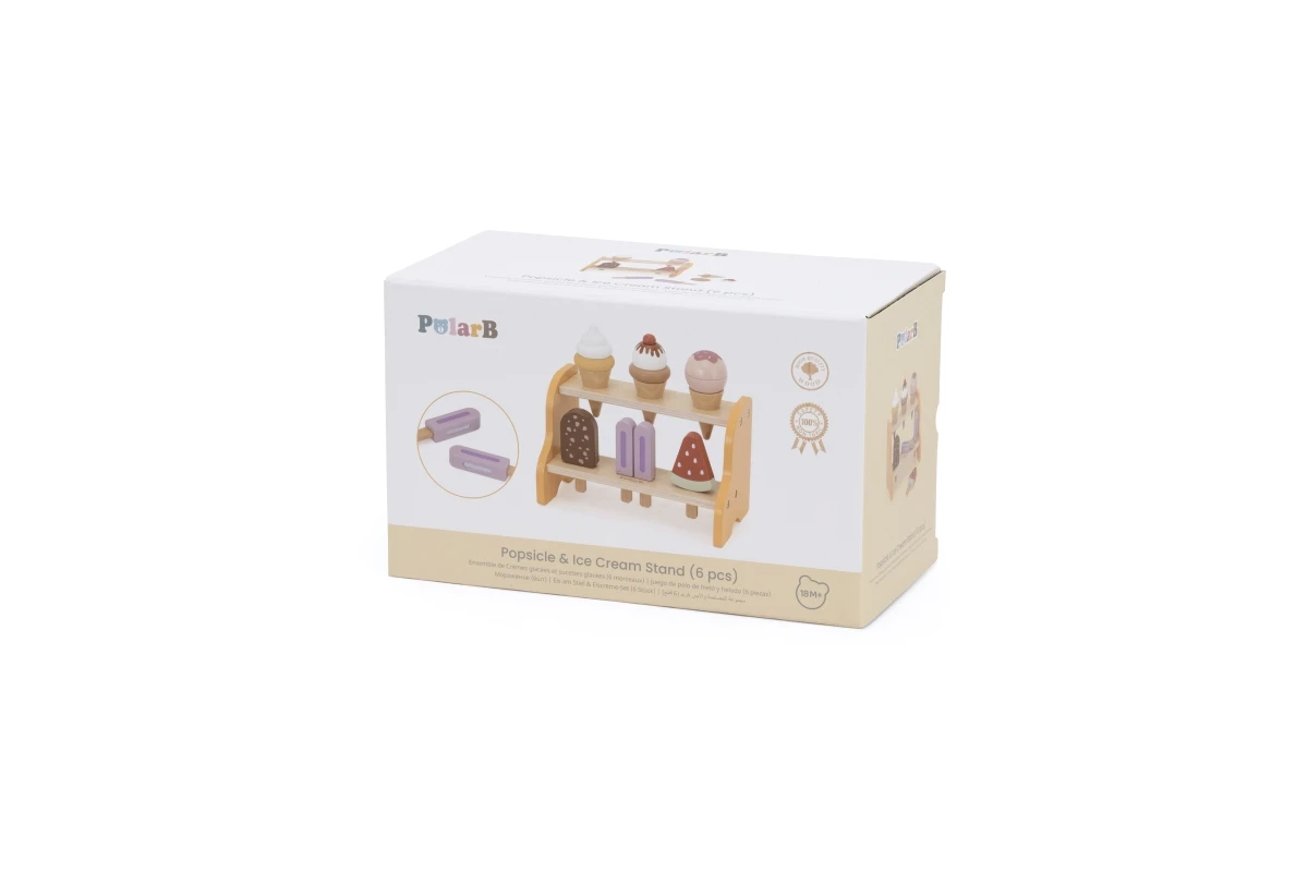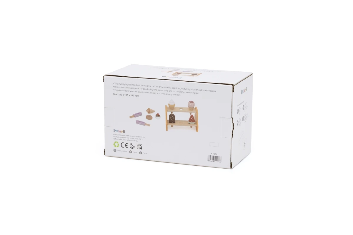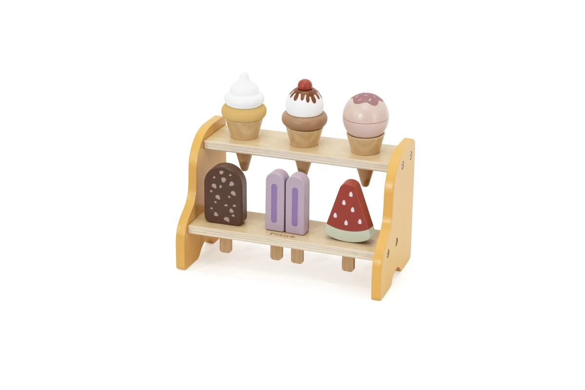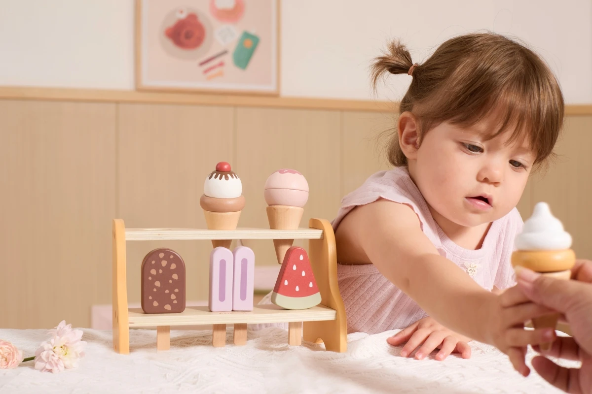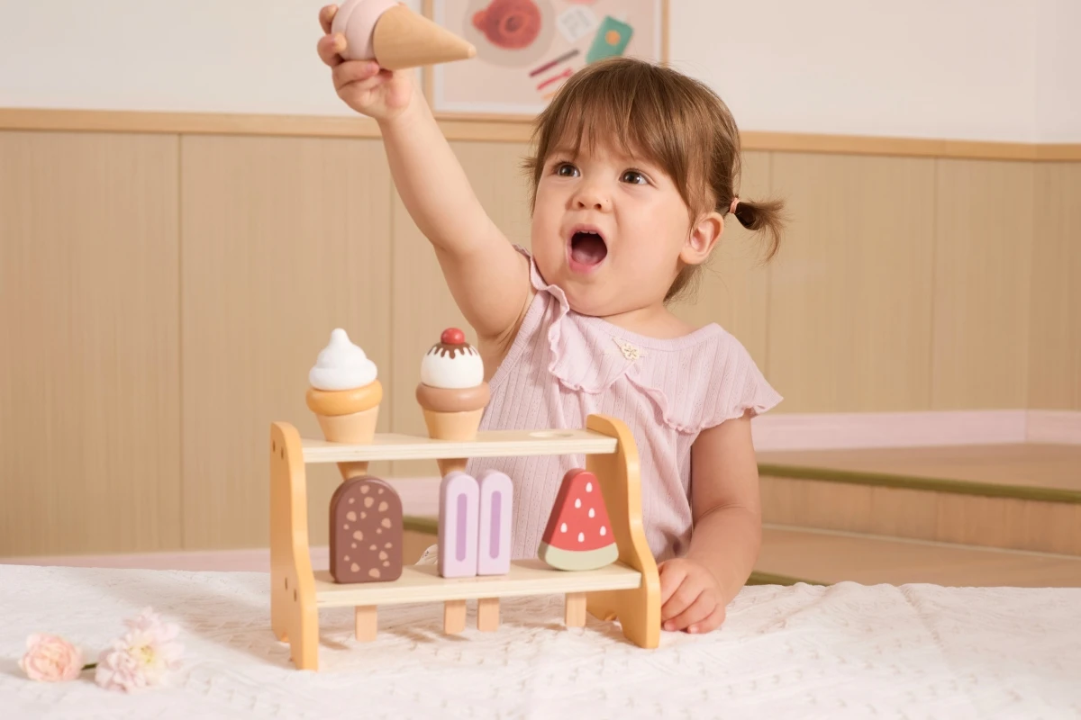 Hra so zmrzlinami rozvíja jemnú motoriku, koordináciu rúk a očí i sociálne zručnosti pri spoločnej hre s rodičmi alebo súrodencami. Vďaka pevnému drevenému prevedeniu je sada odolná a prispôsobená malým detským rúčkam. Držiak umožňuje ľahké ukladanie jednotlivých kúskov a učí deti poriadku.