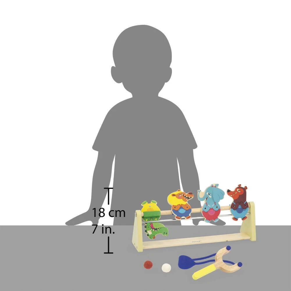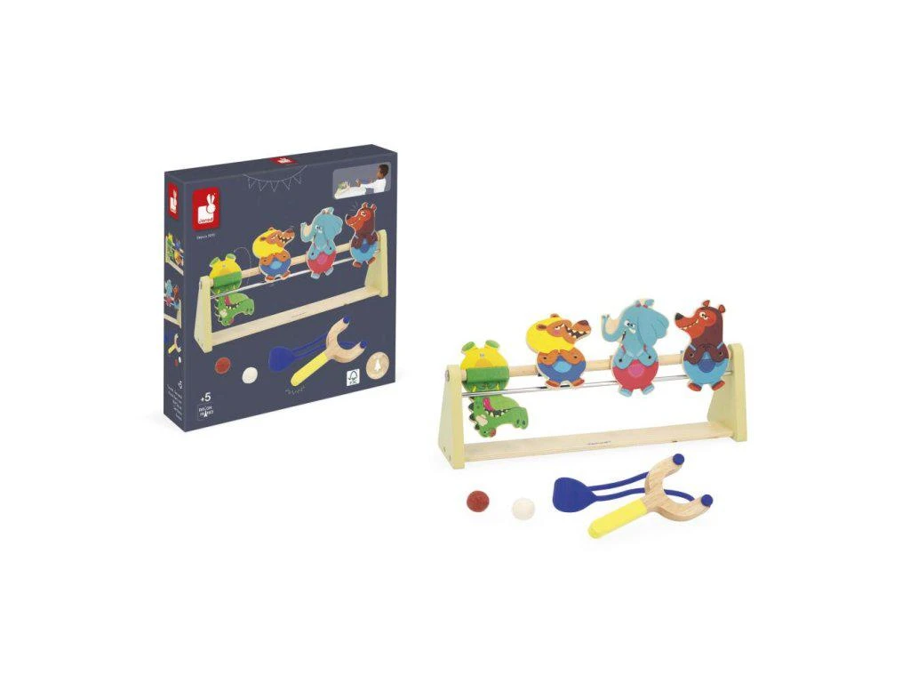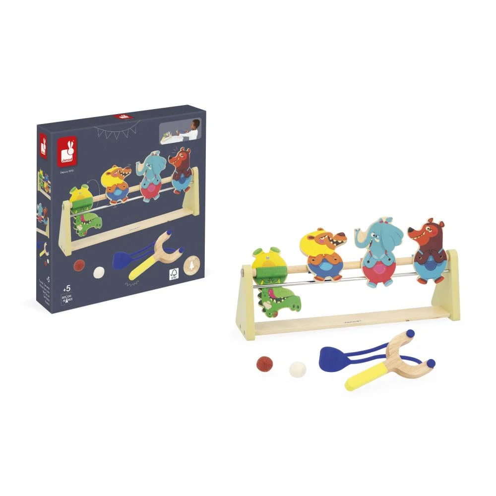 Pomocou dreveného praku a dvoch mäkkých plstených loptičiek sa deti snažia zraziť zvieracie terče, ktoré vďaka magnetickému systému po zásahu efektne padajú dozadu. Postavičky sa síce tvária priateľsky, ale akonáhle ich zasiahnete, ich úsmev zmizne čo deti zaručene pobavia.