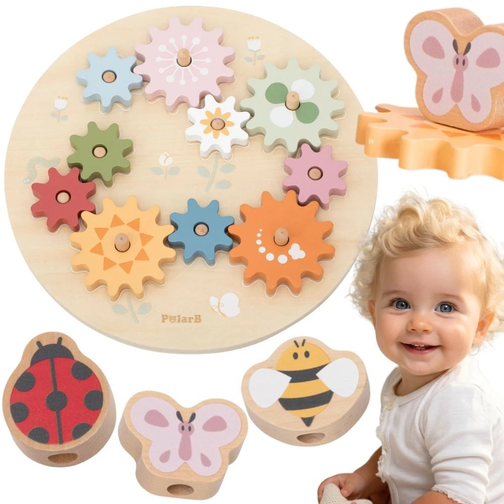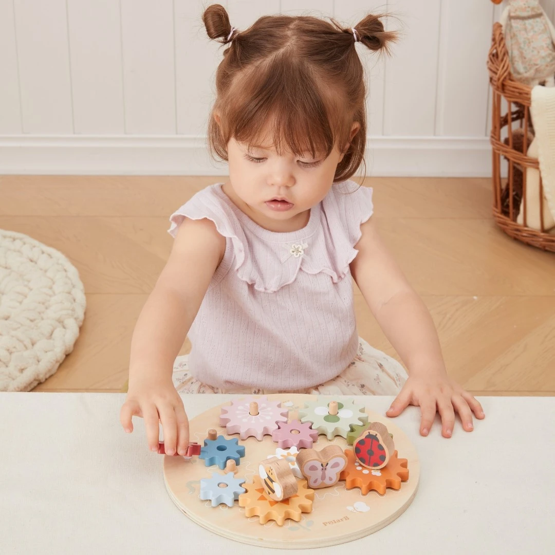 Deti umiestňujú ozubené kolesá podľa bielych čiar a vytvárajú tak prepojené rotácie, čím rozvíjajú logiku a postreh.