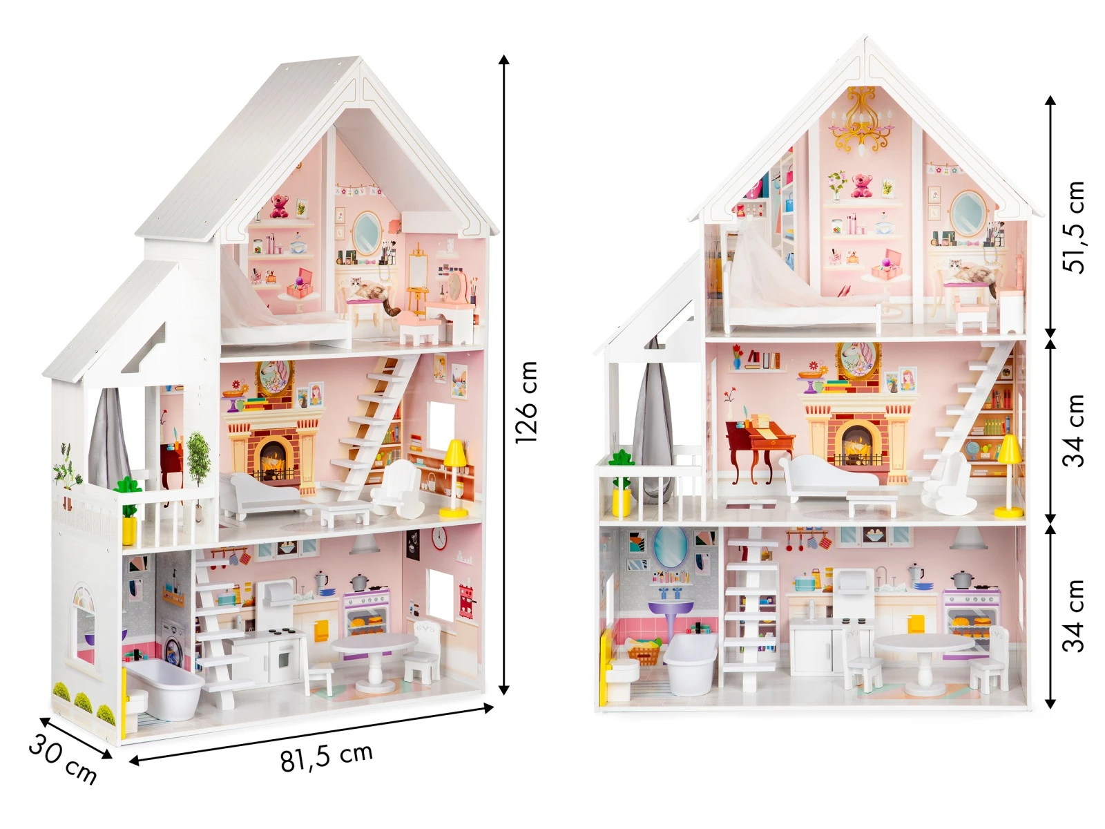 Celý domček ponúka 3 samostatné podlažia a celkom 5 miestností, ktoré verne pripomínajú skutočný rodinný dom. Každá miestnosť má vlastný štýl a výbavu zodpovedajúcu jej účelu, ale deti si môžu kedykoľvek vyskúšať rolu dizajnéra a usporiadať všetko podľa seba. Súčasťou je aj komplet 15 drevených kúskov nábytku, ktoré je možné ľubovoľne vyberať a prestavovať bez obmedzenia. 3 podlažia a balkón. Na prízemí nájdete kúpeľňu a kuchyňu s nábytkom a sporákom. Prvé dve poschodia spájajú biele drevené schody. Na prvom poschodí je priestranná obývacia izba s pohovkou, stolíkom a hojdacím kreslom. Na rovnakej úrovni sa nachádza aj malý balkón so zavesenou hojdačkou. Najvyššie poschodie patrí útulnej spálni s veľkou posteľou a toaletným stolíkom. Takto navrhnuté usporiadanie dáva neobmedzené možnosti hry a zaručuje hodiny tvorivej zábavy.