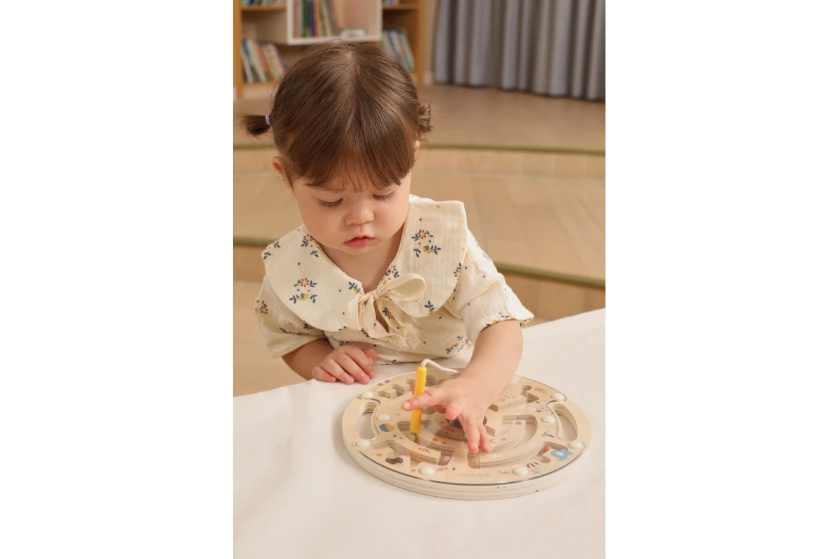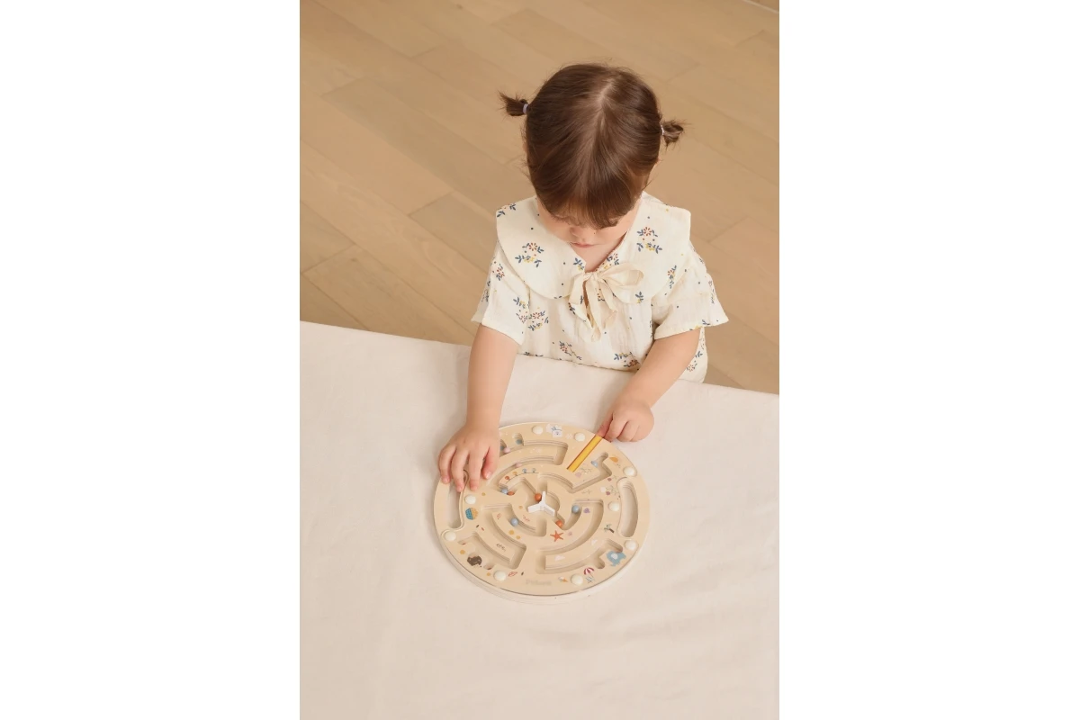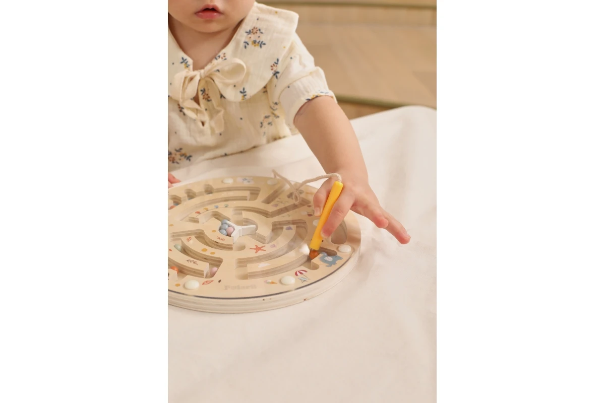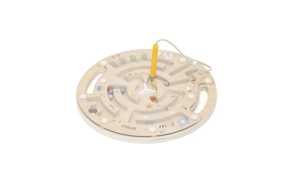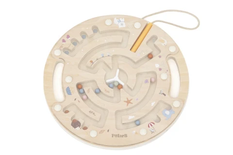 Drevená magnetická hra - labyrint je zábavná a zároveň vzdelávacia hračka pre najmenšie deti. Pomocou magnetickej ceruzky deti posúvajú farebné guličky po vyznačených dráhach labyrintu a učia sa tak sústredeniu, trpezlivosti a presnosti pohybov.