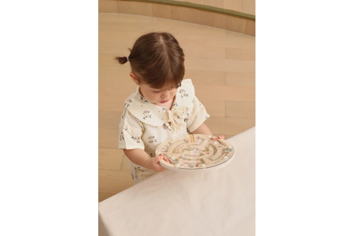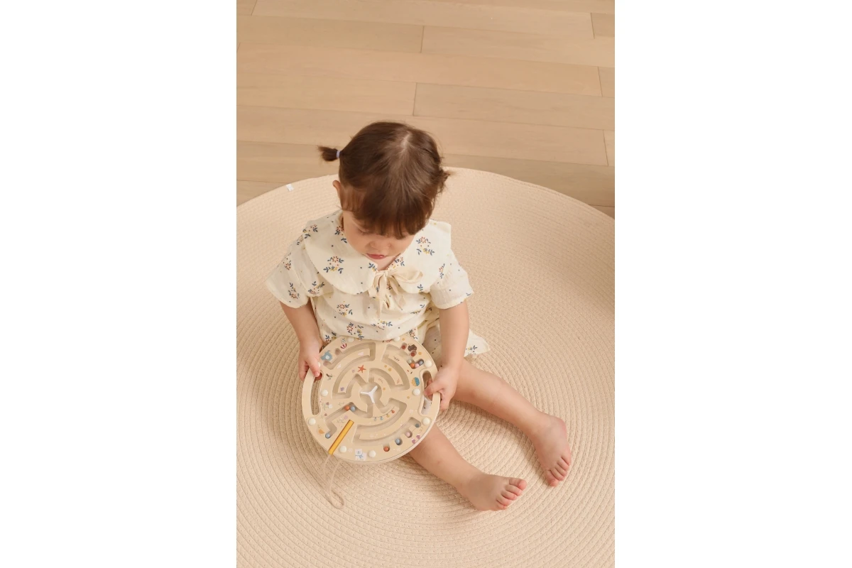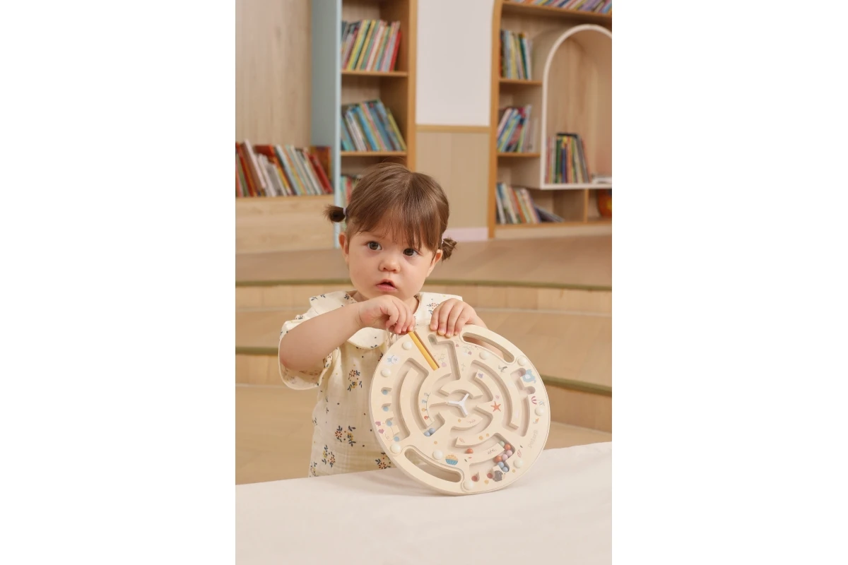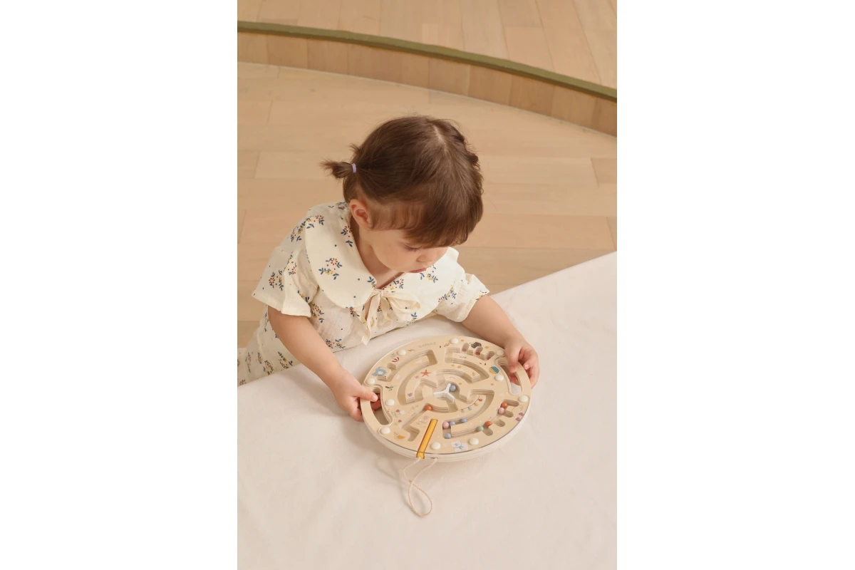 Drevená magnetická hra - labyrint je zábavná a zároveň vzdelávacia hračka pre najmenšie deti. Pomocou magnetickej ceruzky deti posúvajú farebné guličky po vyznačených dráhach labyrintu a učia sa tak sústredeniu, trpezlivosti a presnosti pohybov.