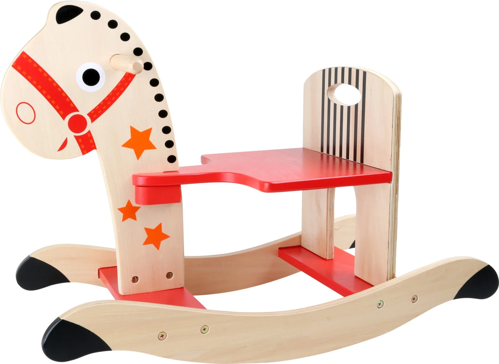 Drevený hojdací kôň je klasická aktívna hračka pre deti s robustným a stabilným dreveným prevedením. Má široké sedadlo s bezpečnou výškou 24 cm, pohodlné opierky nôh a drevené úchyty na hlave koníka pre pevné držanie. Podporuje pohybovú aktivitu, rovnováhu a koordináciu dieťaťa.