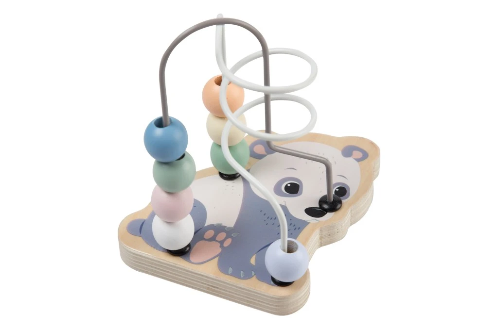Deti môžu posúvať korálky po kovových dráhach, trénovať koordináciu ruka-oko, jemnú motoriku a sústredenie. Hračka je vyrobená z kvalitného bukového dreva a farbená nezávadnými, zdravotne bezpečnými farbami.