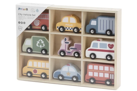 Drevená sada 9 dopravných prostriedkov. Balené v drevenej krabičke. Farebné prevedenie a rôzne typy vozidiel podporujú kreatívnu hru, rozvíjajú fantáziu aj jemnú motoriku. Vďaka bezpečnému spracovaniu je ideálny na každodenné hranie aj ako krásny darček.