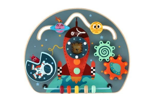 Drevený edukačný labyrint s vesmírnou tematikou obsahuje herné funkcie - bludisko, otočné bloky, ozubené kolesá a korálky.
