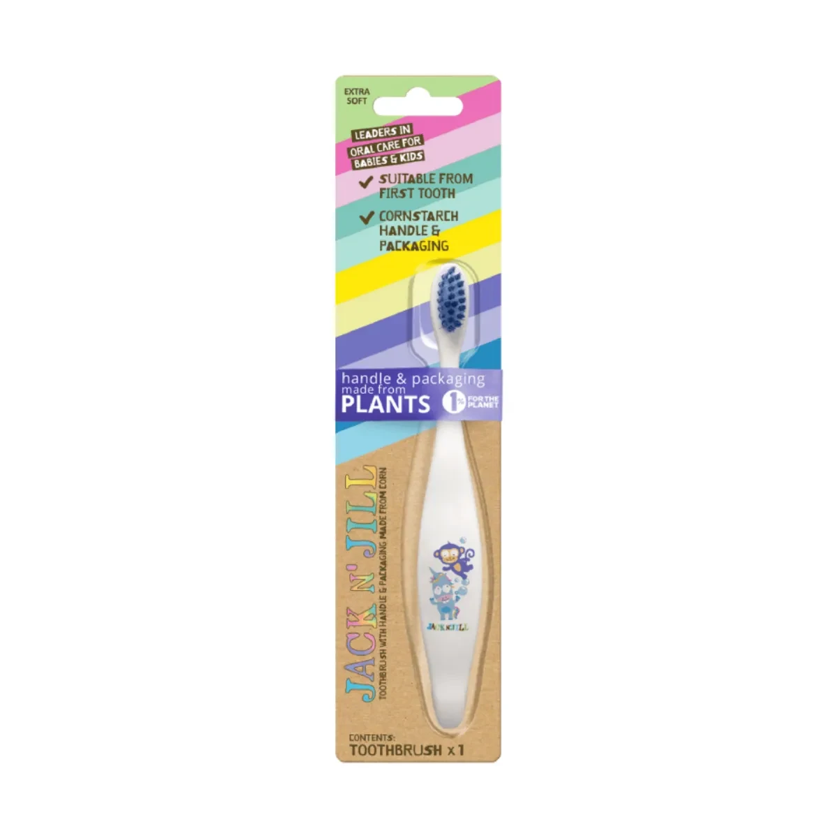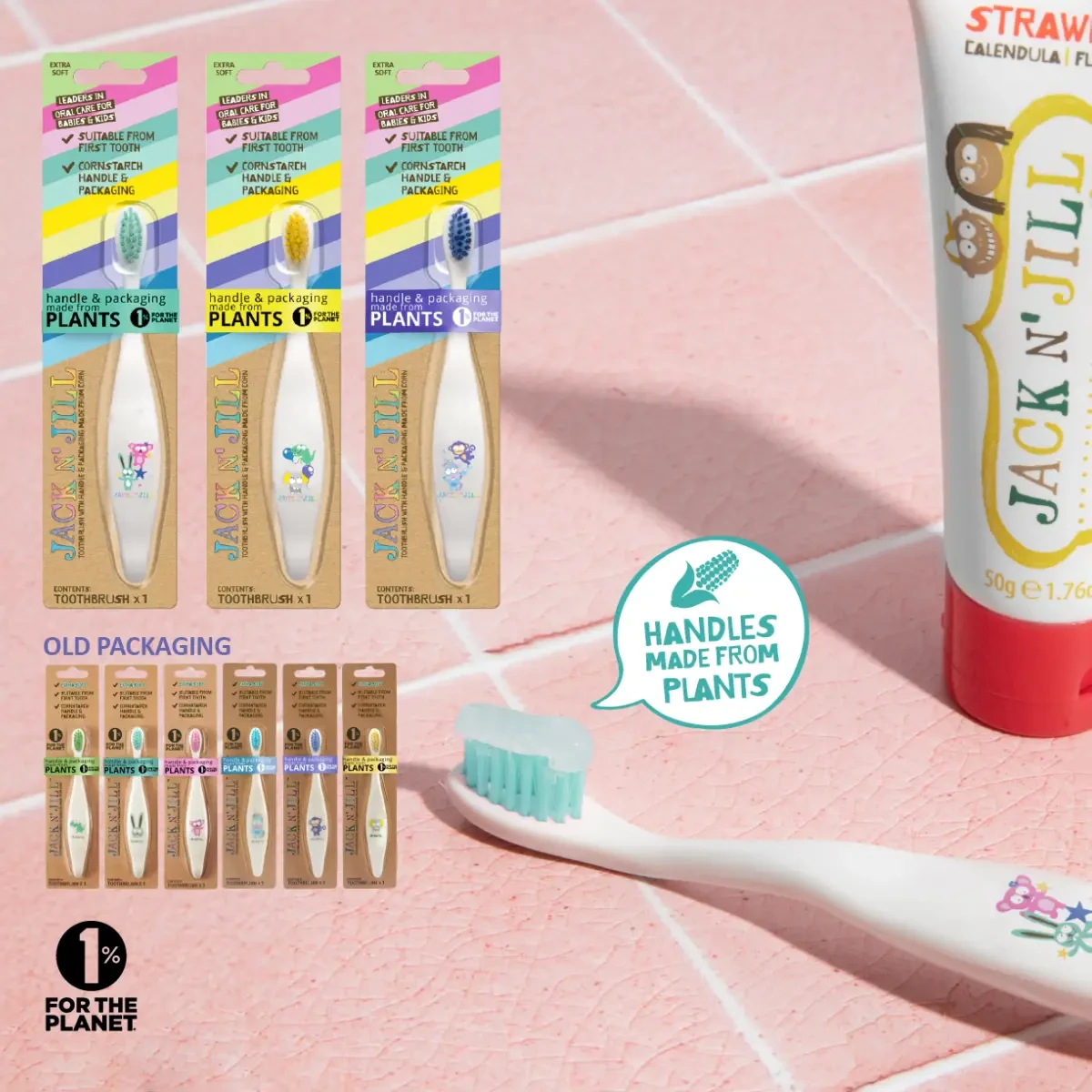 Celé balenie zubnej kefky Jack N'Jill je biologicky rozložiteľné - obal z recyklovaného papiera a okienko zo 100% kukuričného škrobu.