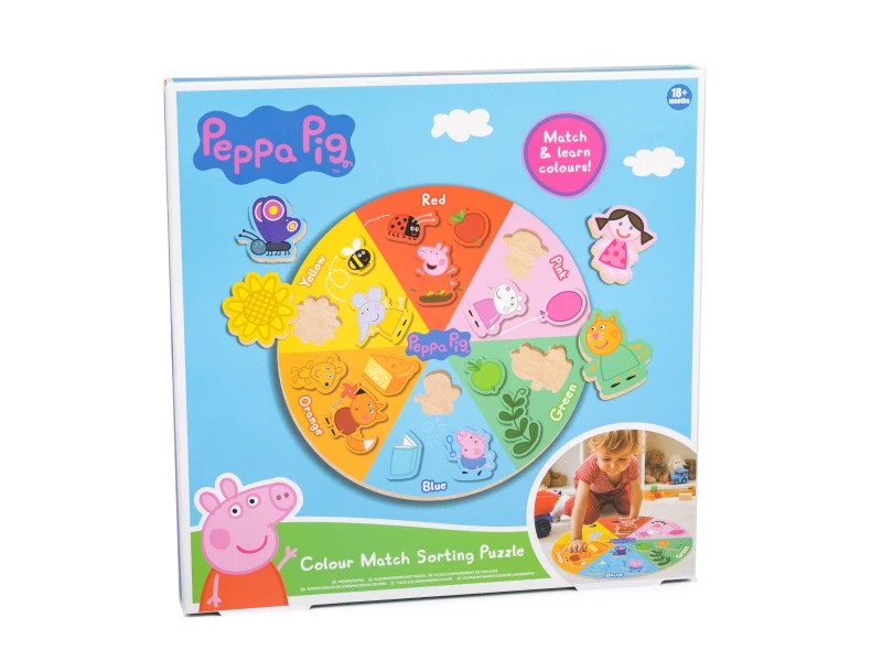 Drevené vkladacie puzzle s obľúbenou postavičkou Peppa Pig je navrhnuté špeciálne pre deti od 18 mesiacov. Puzzle má kruhový dizajn s priemerom 29 cm a obsahuje väčšie dieliky, ktoré sú ľahko uchopiteľné malými ručičkami.