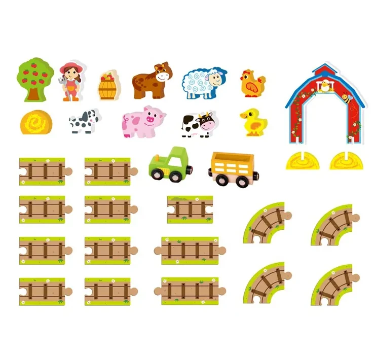 - Bohaté na detaily: Sada obsahuje krásne spracované drevené dieliky, každý natretý netoxickými, deťmi bezpečnými farbami. Objavte rôzne hospodárske zvieratá, ovocné stromy a dokonca aj kúzelný malý vláčik s koľajnicami, ktoré umožňujú nápaditú hru a interakciu.