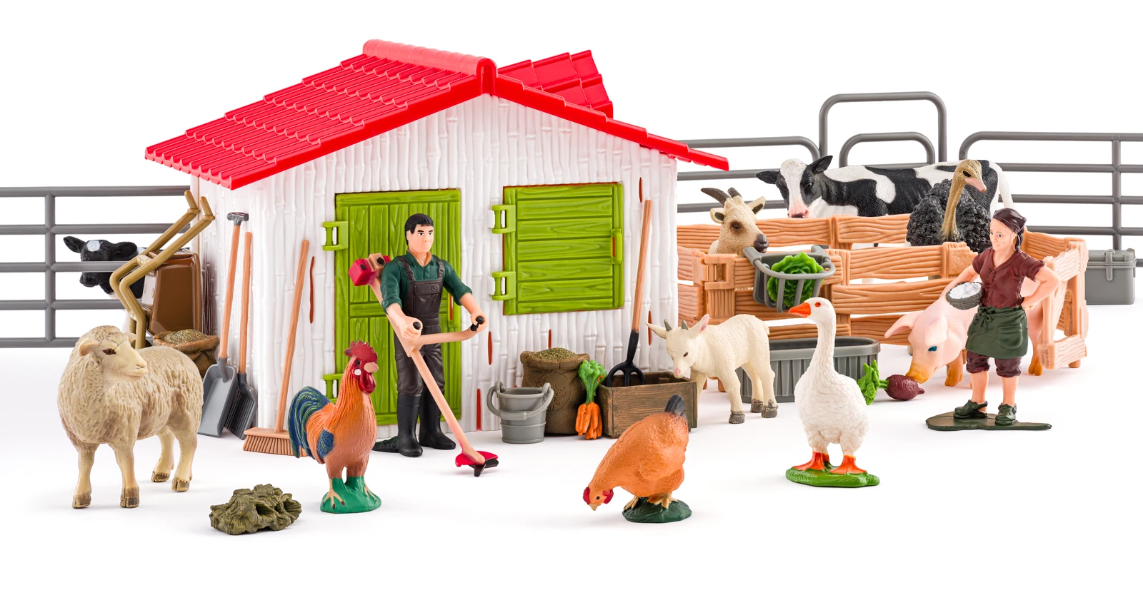 Obsahuje tie najznámejšie zvieratá aj s mláďatami, farmárov s farmárkou, hospodársku budovu s ohradami a množstvom ďalšieho príslušenstva. Zvieratá: krava, teľa, ovce, prasa, koza, kozľa, pštros, kohút, sliepka a hus.