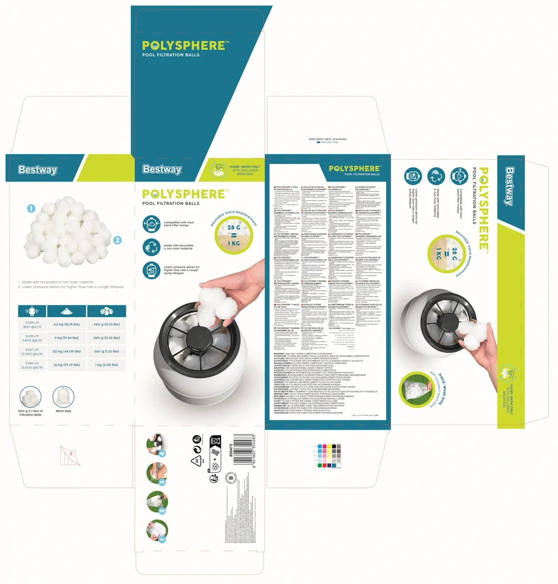 Moderná filtrácia pre dokonale čistú vodu v bazéne. Filtračné gule Bestway Flowclear™ Polysphere predstavujú efektívnu a ekologickú alternatívu ku klasickému piesku. Vďaka svojej ľahkosti a vysokej účinnosti zaistí krištáľovo čistú vodu v nadzemných bazénoch rýchlejšie as menšou námahou.
