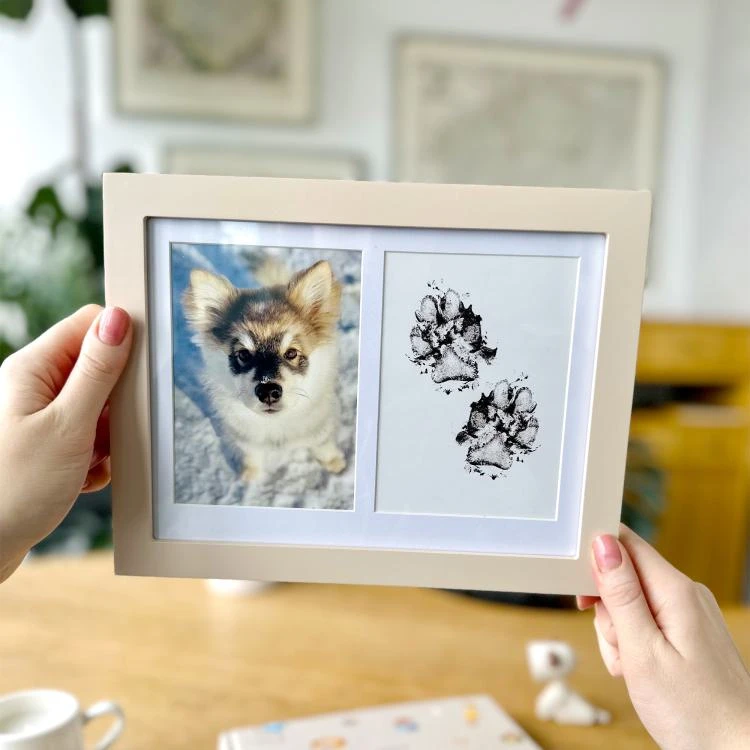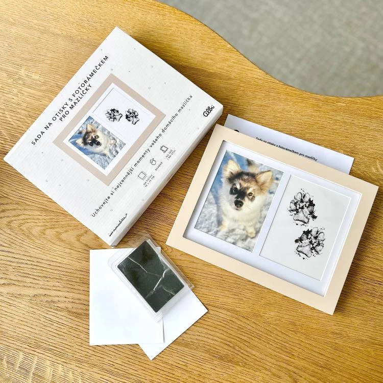 Balenie obsahuje: béžový fotorámik, bezpečnú čiernu atramentovú podložku na odtlačky, potlačové papiere a návod.