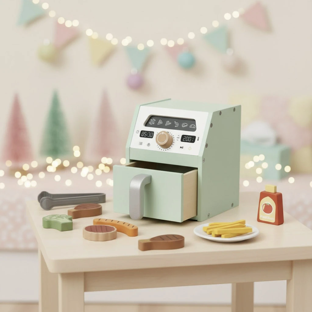 Malí kuchári môžu konečne „vypražiť“ svoje obľúbené hranolky! Táto drevená fritéza pre deti je skvelým doplnkom do každej detskej kuchynky a prinesie do hry novú dávku fantázie.