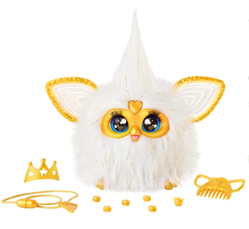 Rozkošný Furby Gold Glam sa pýši bielou srsťou so zlatými doplnkami. Toto zvedavé malé stvorenie je interaktívna hračka s 5 hlasovými režimami a viac ako 600 frázami, vtipmi, pesničkami a množstvom ďalších funkcií, ktoré môžete objavovať.