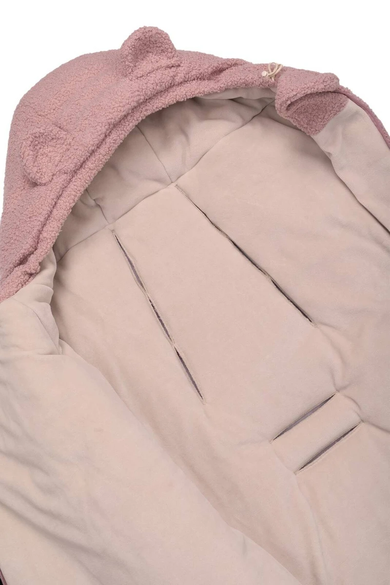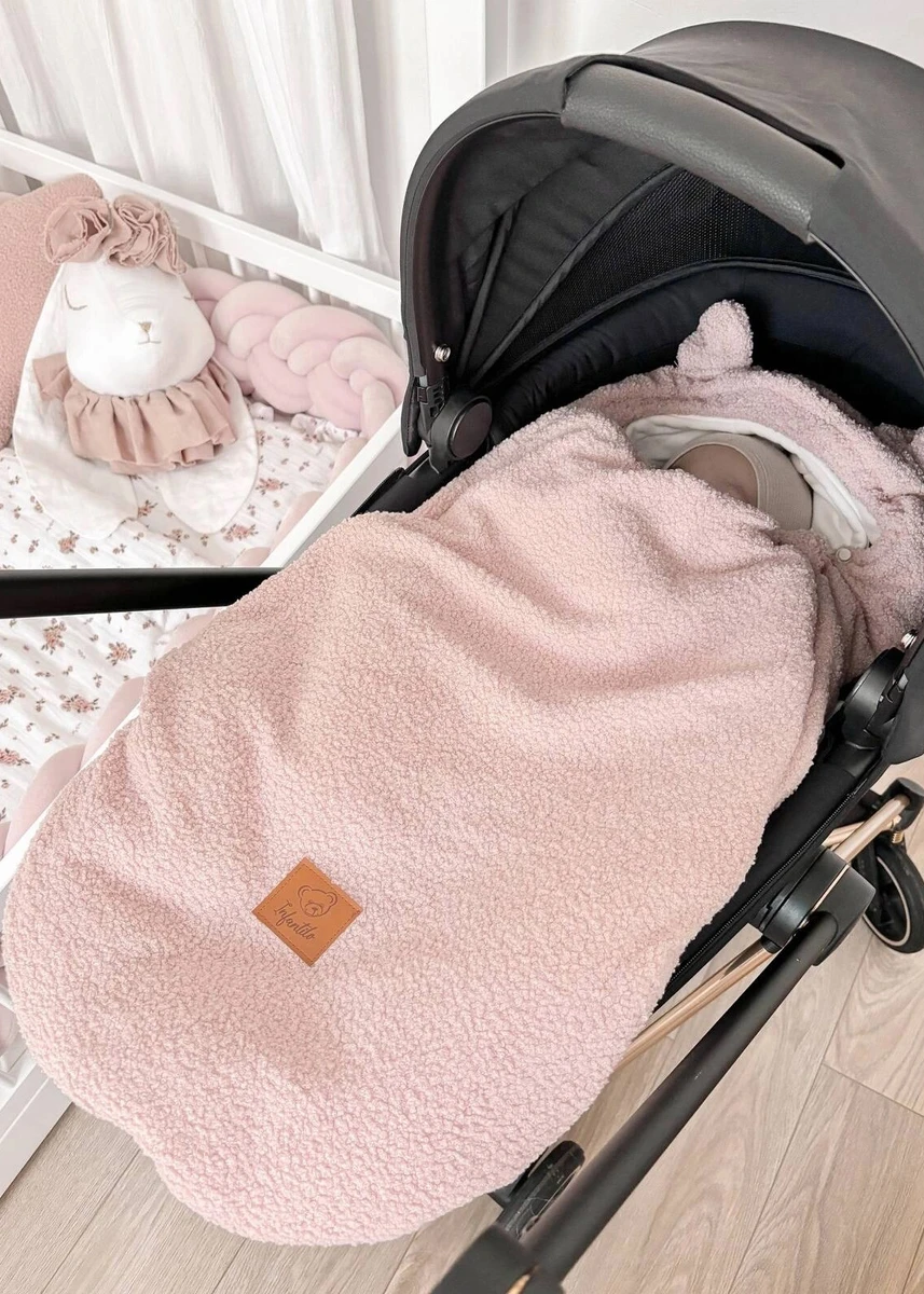 Vnútro spacáku je vyrobené z mäkkého bavlneného velúru, ktorý je šetrný k detskej pokožke. Vonkajšiu vrstvu tvorí elegantná tkanina boucle so štruktúrou baránka. Výplň tvorí antialergické silikónové vlákno všité do švov, čo zabraňuje jeho presúvaniu pri praní a používaní.