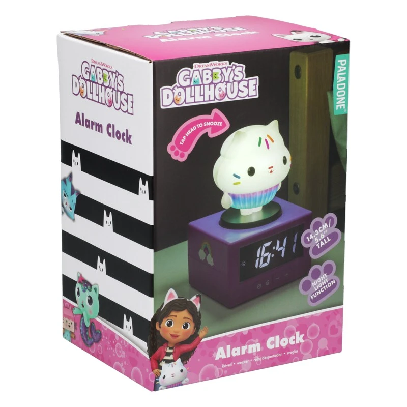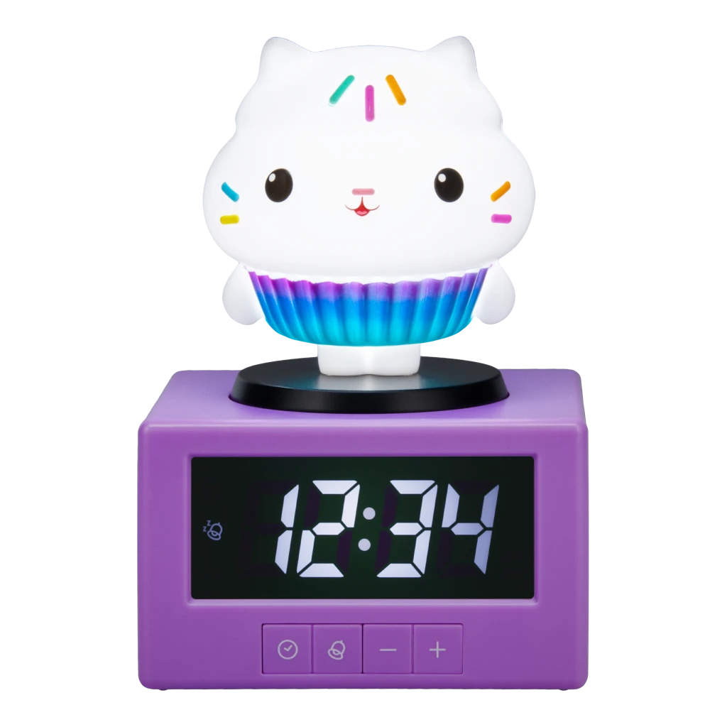 Gabby budík je navrhnutý ako veselý a hravý pomocník pre deti, ktorý im uľahčí vstávanie každé ráno. Jeho hlavnou súčasťou je fialový základ v tvare kocky, na ktorom je umiestnená postavička v tvare roztomilého mačacieho cupcakes. Táto figúrka je biela s farebnými zdobeniami pripomínajúcimi posyp na sladkom dezerte, čo dodáva budíku príjemný a hravý vzhľad vhodný do detskej izby. Na boku základne je potom veselá nálepka dúha s mráčikmi, ktorá podčiarkuje hravosť celého dizajnu.