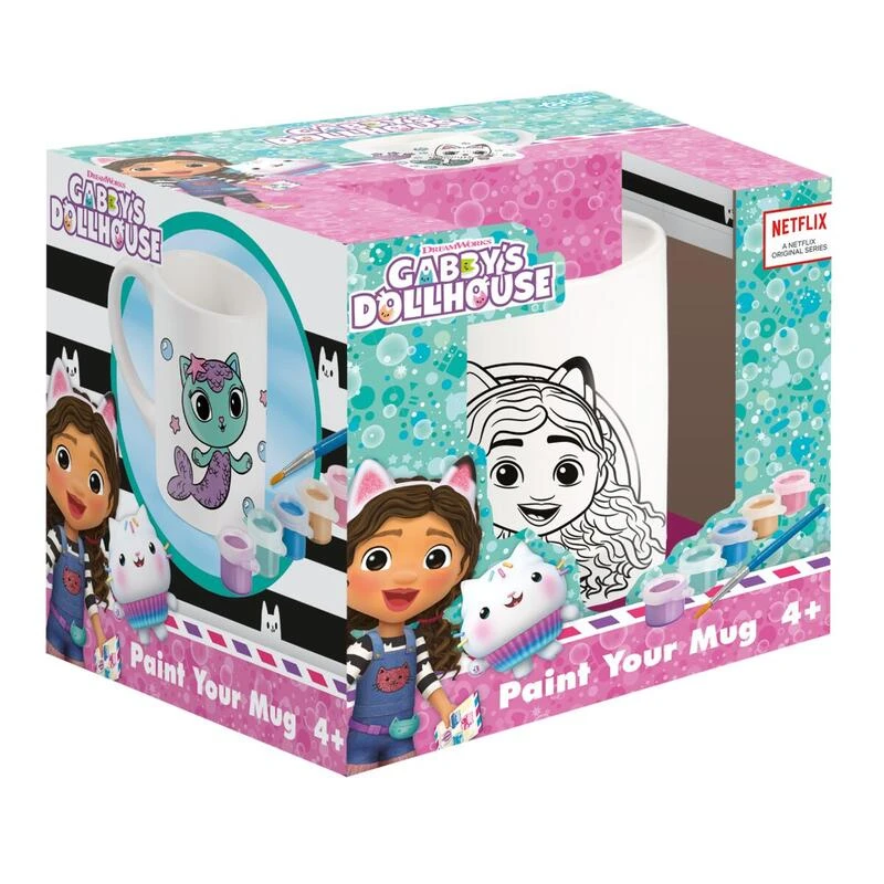 Kreatívna sada na maľovanie keramického hrnčeka s motívom Gabby's Dollhouse. Obsahuje hrnček, štetec, 5 farieb a návod. Po zaschnutí je nutné zapiecť, vhodné pod dohľadom dospelých.