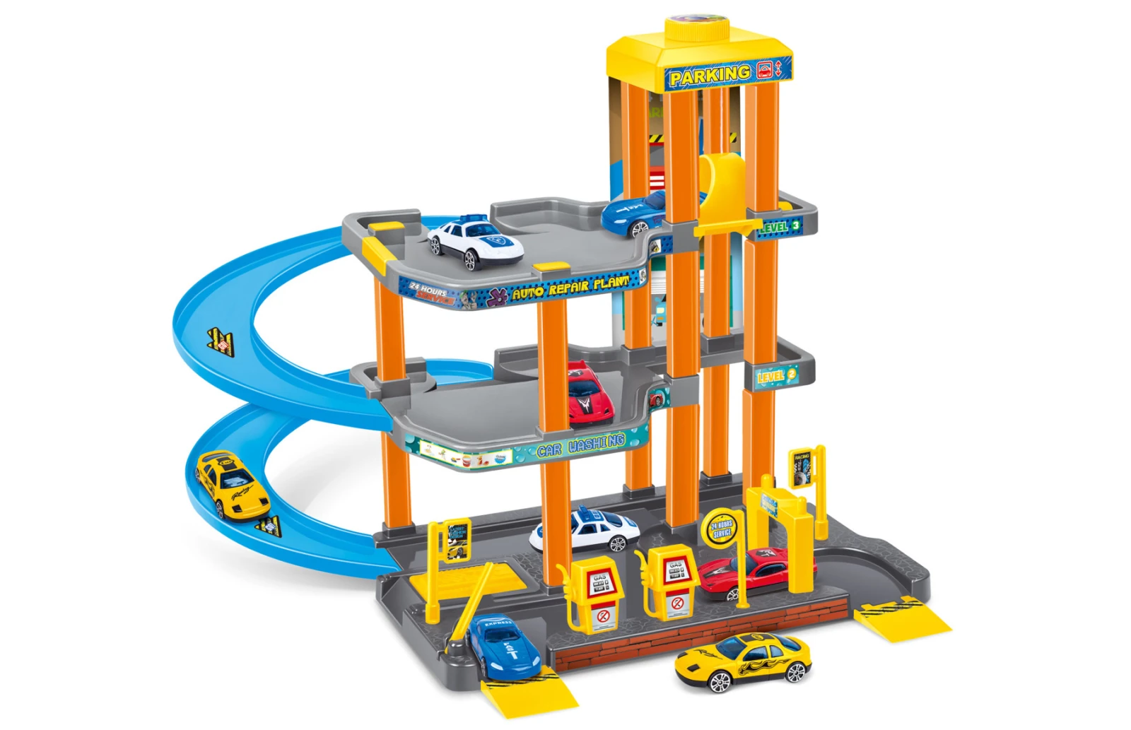 Veľkosť auta 7 cm. Manuálny výťah, tankovacia pumpa.