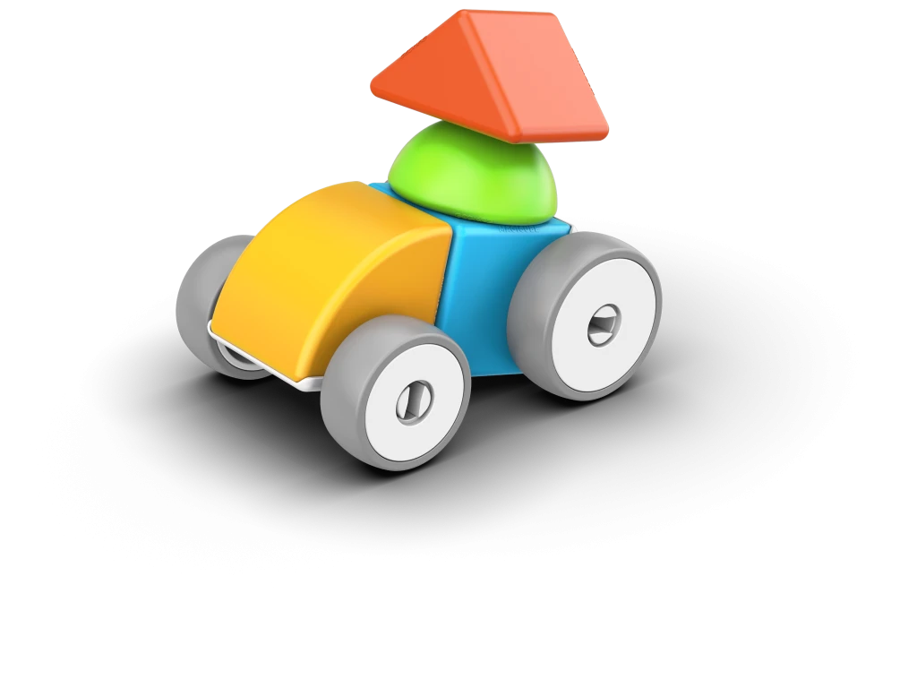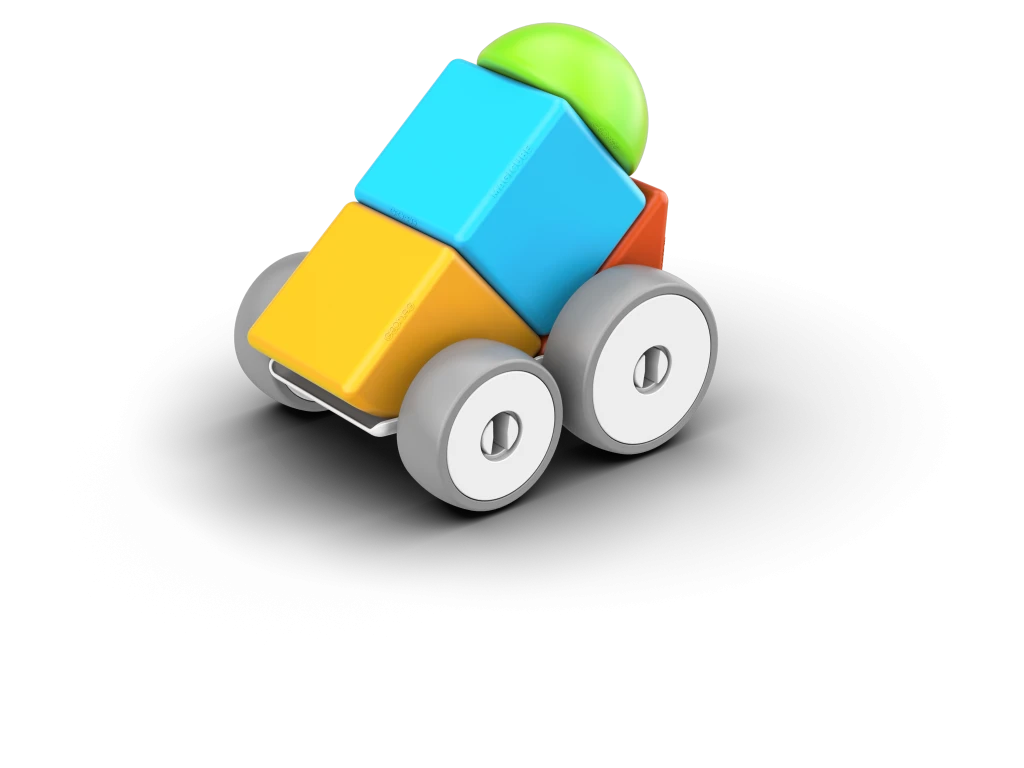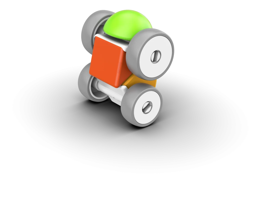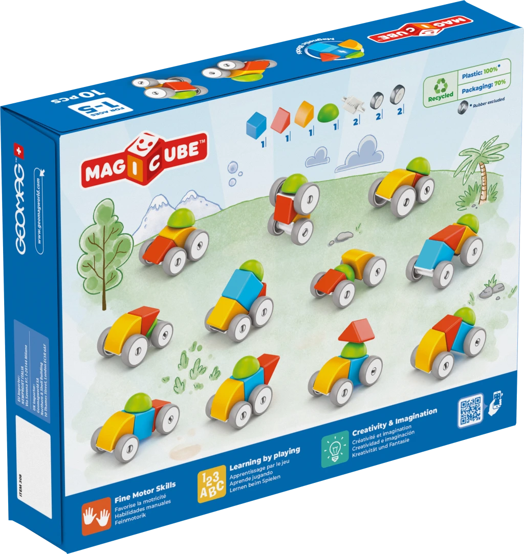 Magnetická stavebnica Geomag Magicube obsahuje 4 magnetické prvky rôznych tvarov a farieb a 4 kolieska s dvoma podvozkami.