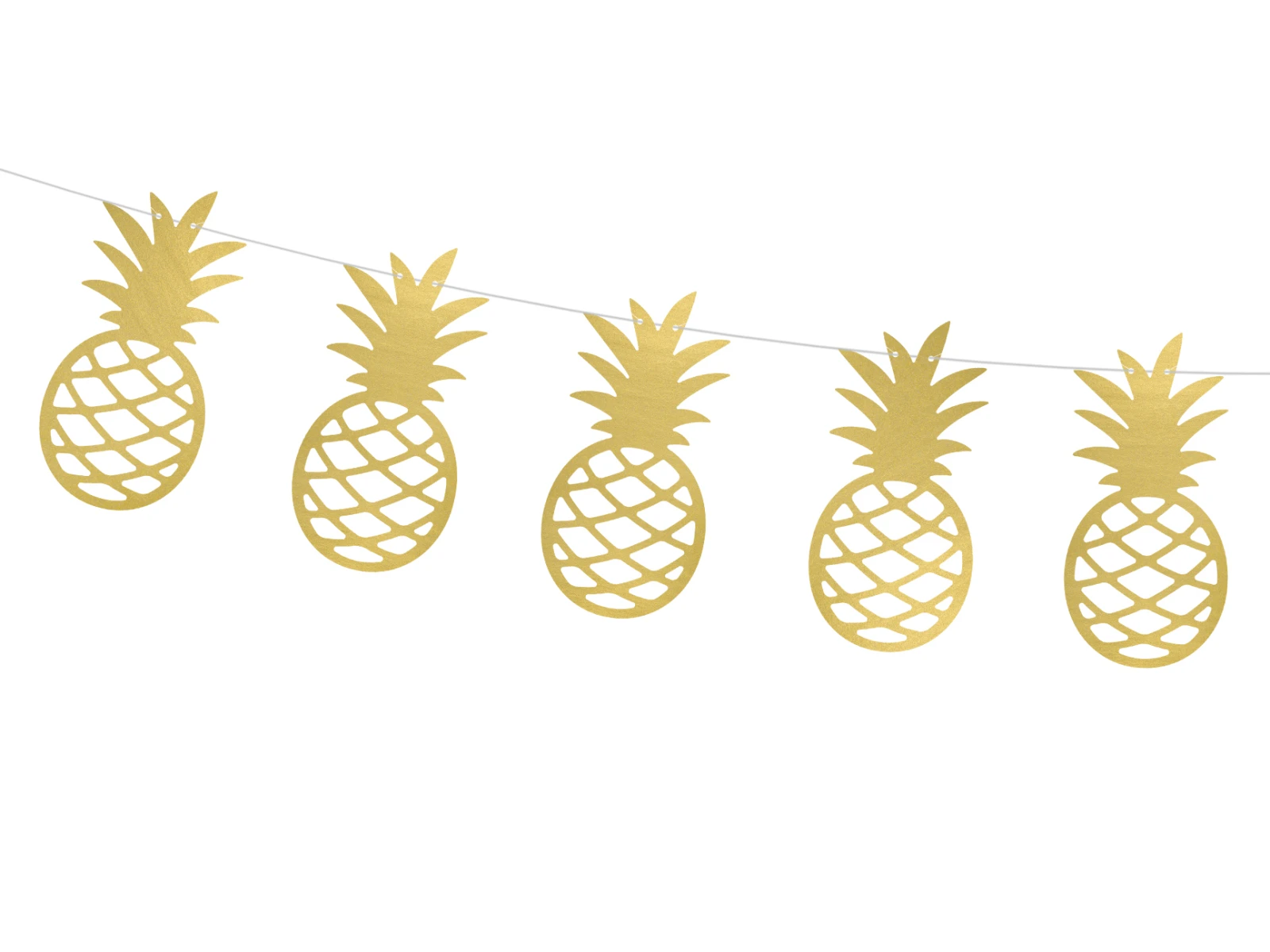 Vyrezávaná girlanda zo zlatého metalického papiera v tvare ananásov, „urob si sám“, veľkosť po zložení je cca 13 cm na výšku a dĺžka girlandy je cca 1.5 metra.