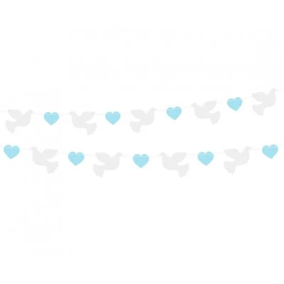 Papierová girlanda s motívom hrdličiek a modrého srdca je krásnou dekoráciou na slávnostné aj romantické príležitosti. Jemné prevedenie v modrých tónoch sa skvele hodí na baby shower, oslavu narodenia bábätka, krstiny alebo iné slávnostné udalosti.