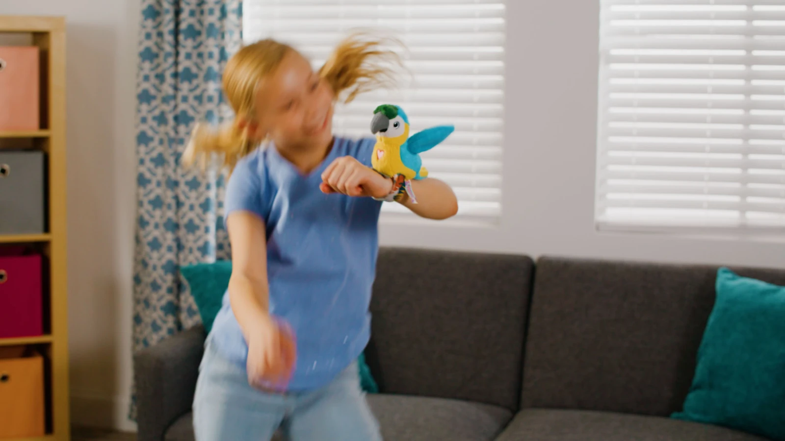 Vtáčika si môžeš pripnúť na ruku a užiť si s ním veľa zábavy. Opakuje, spieva vtáčiu pesničku a máva krídlami.
