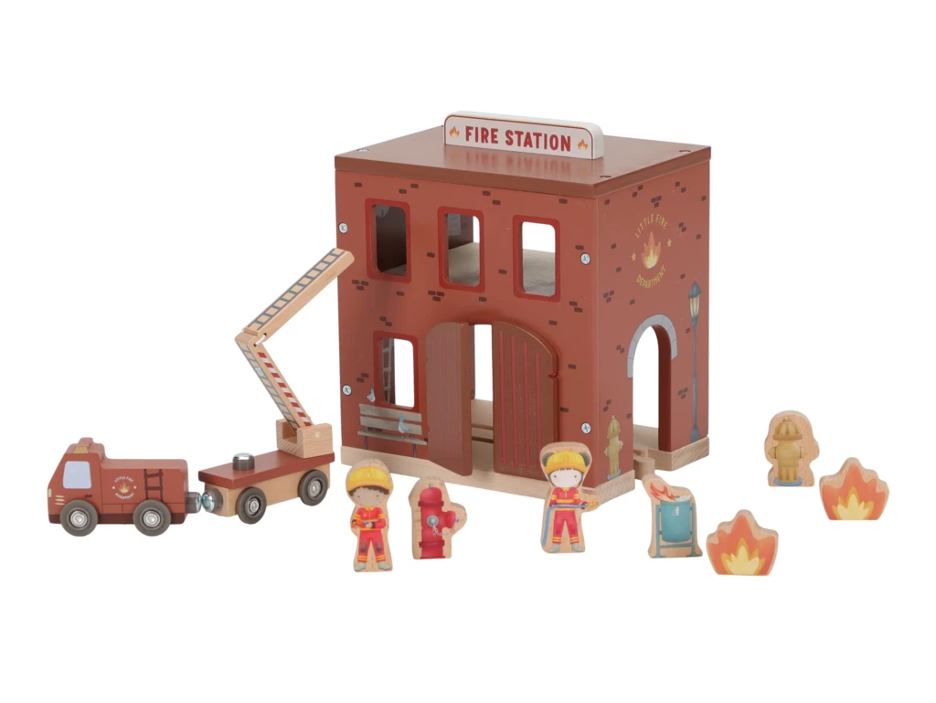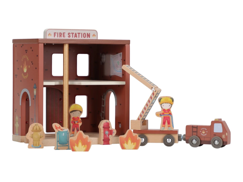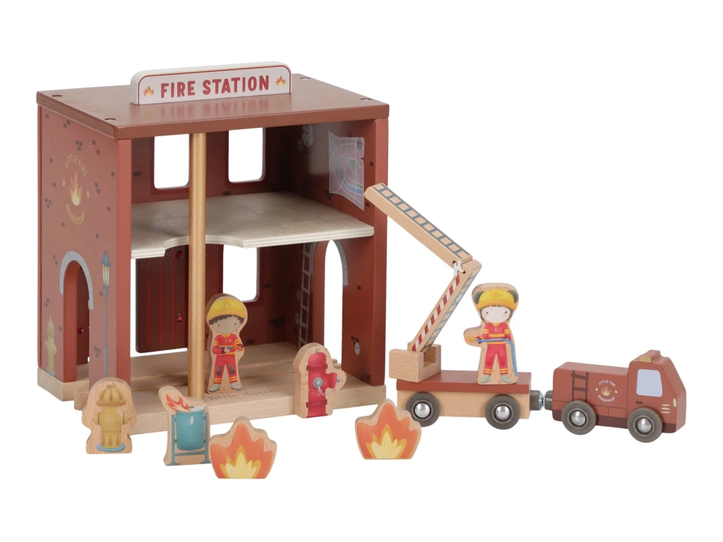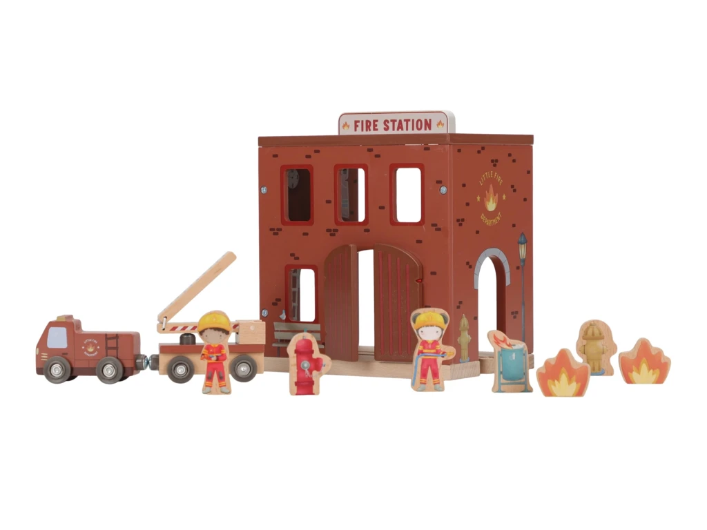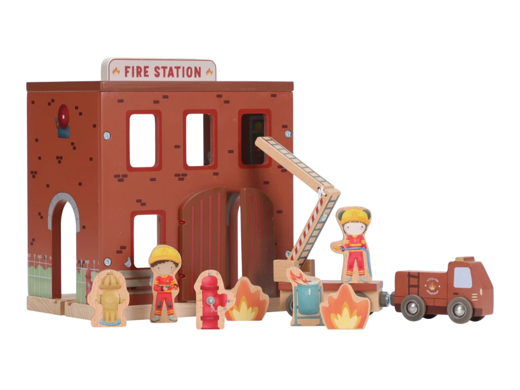 Súčasťou sady sú figúrky hasičov, oheň a horiace popolnice pre realistické hranie. Dvere stanice je možné otvoriť, aby mohol zásah začať čo najrýchlejšie. Hasičská stanica je kompatibilná s drevenou vláčikodráhou Little Dutch, čo umožňuje ešte viac zábavy a kombinácií.