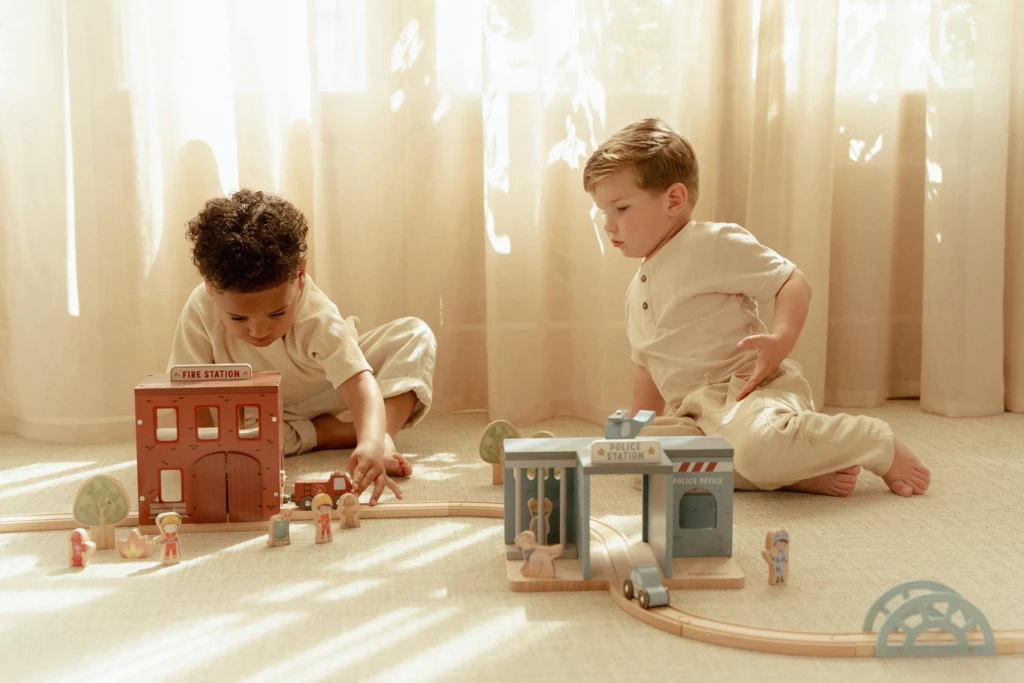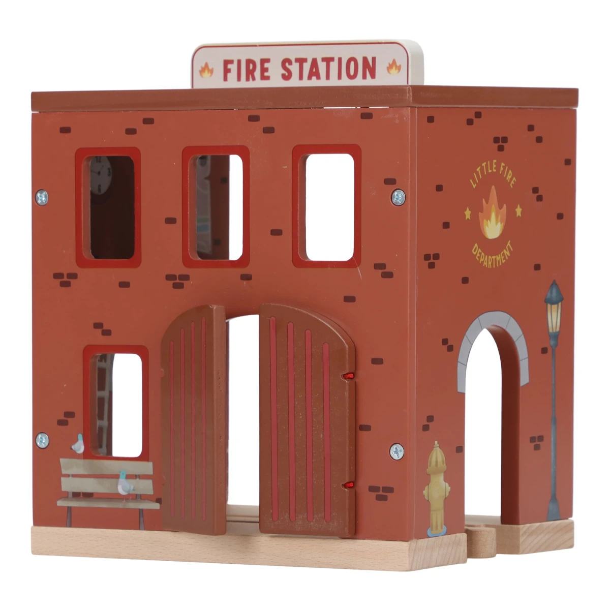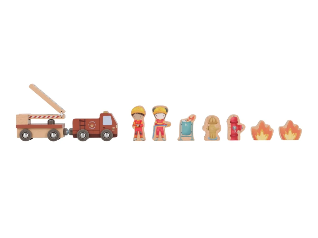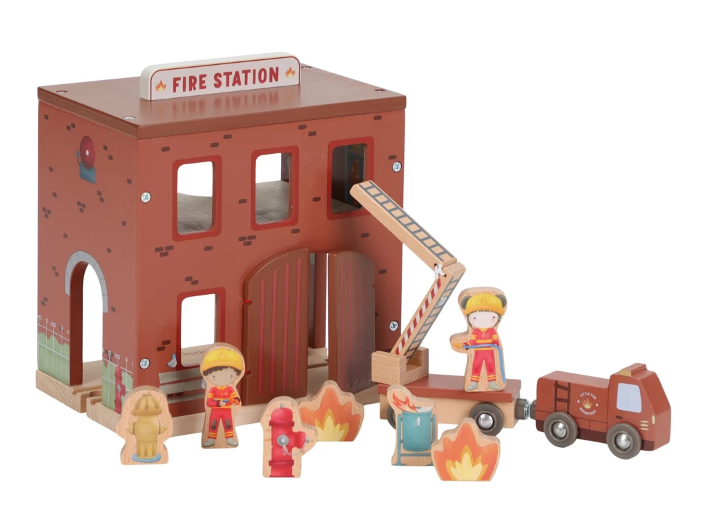 Súčasťou sady sú figúrky hasičov, oheň a horiace popolnice pre realistické hranie. Dvere stanice je možné otvoriť, aby mohol zásah začať čo najrýchlejšie. Hasičská stanica je kompatibilná s drevenou vláčikodráhou Little Dutch, čo umožňuje ešte viac zábavy a kombinácií.