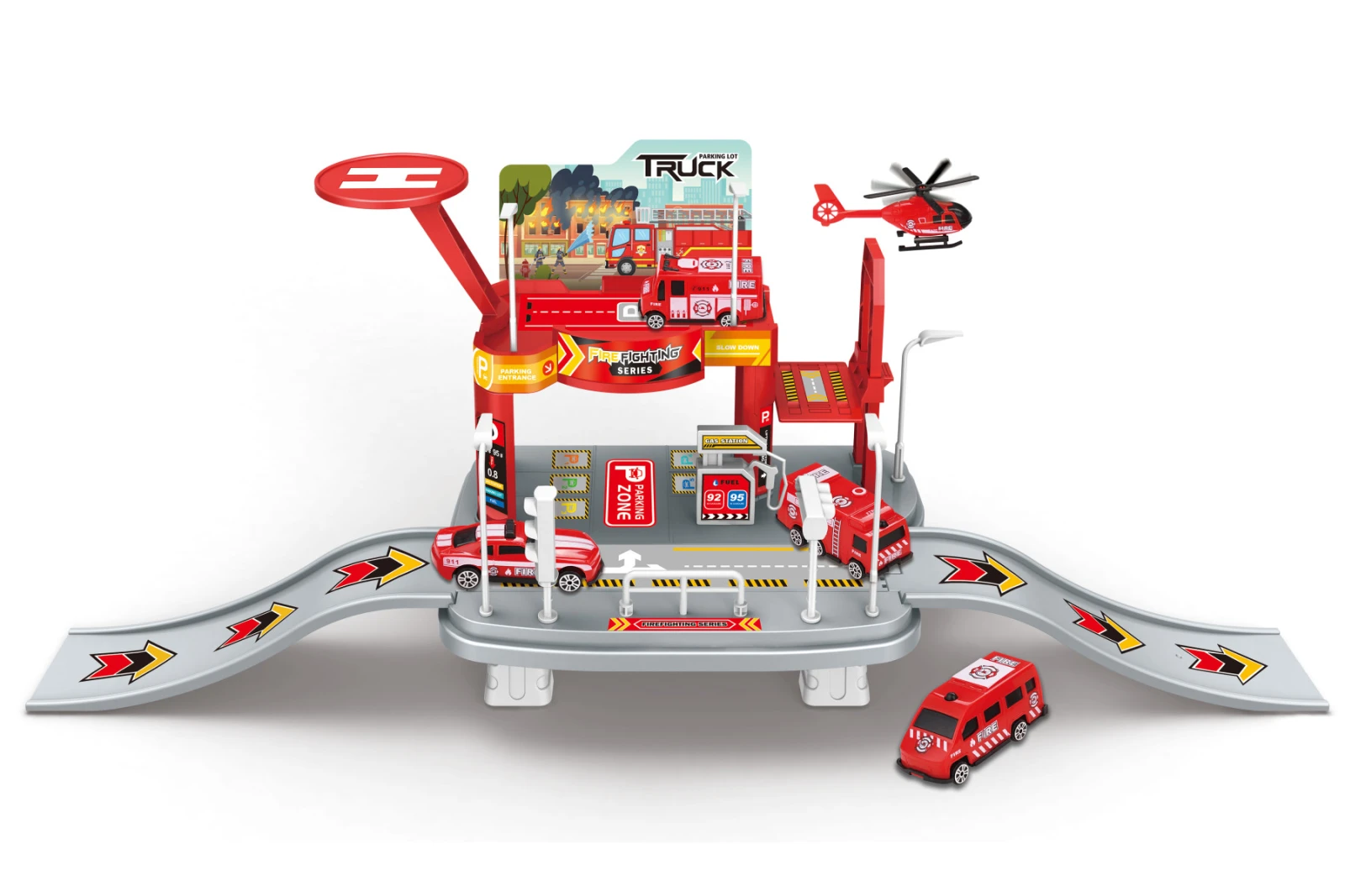 Súčasťou 4 autá 7 cm, 1 vrtuľník 9 cm, manuálny výťah, heliport, čerpacie stanice, značky. Obrázkový návod na zloženie na bočnej strane obalu.