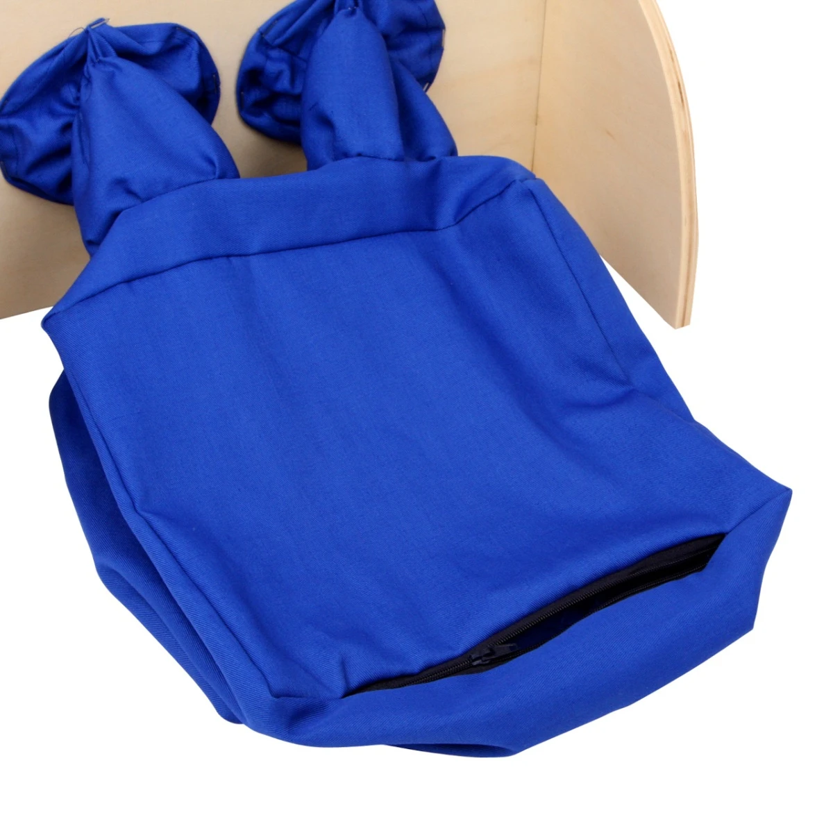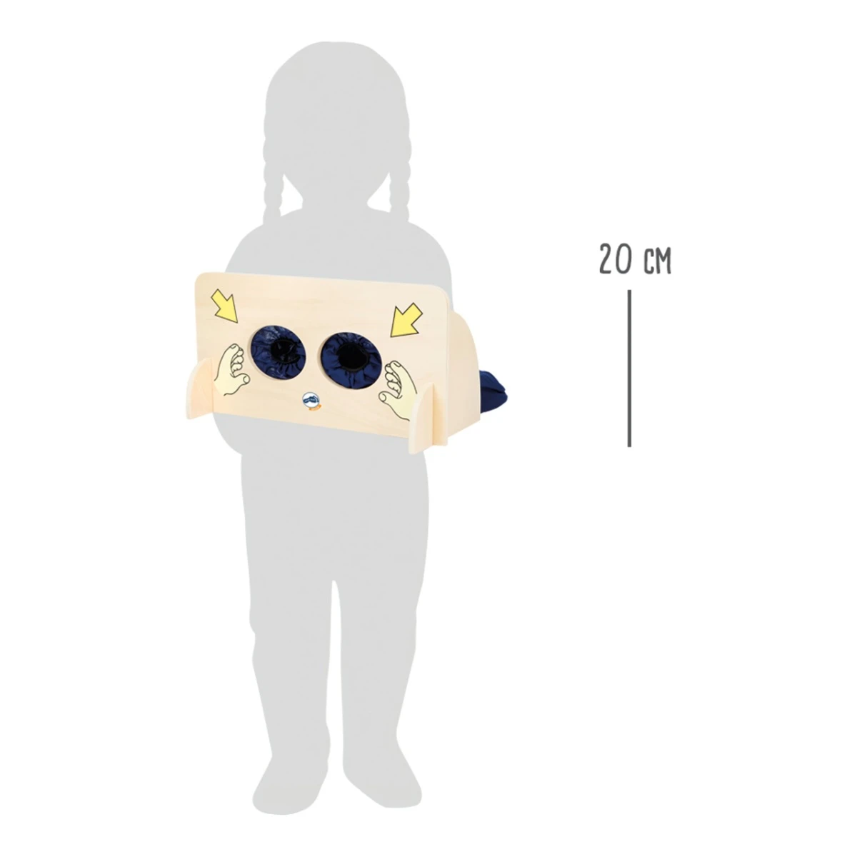 Rôzne predmety ukryte do látkového vrecka za drevenou stenou. Vrecko je opatrené zipsom, pre ľahšie vkladanie predmetov. Deti vložia ruky do textilných rukávov a podľa hmatu sa snažia rozpoznať, o aký predmet ide.