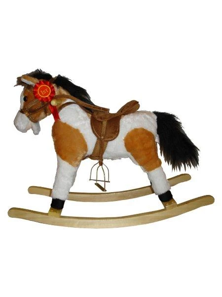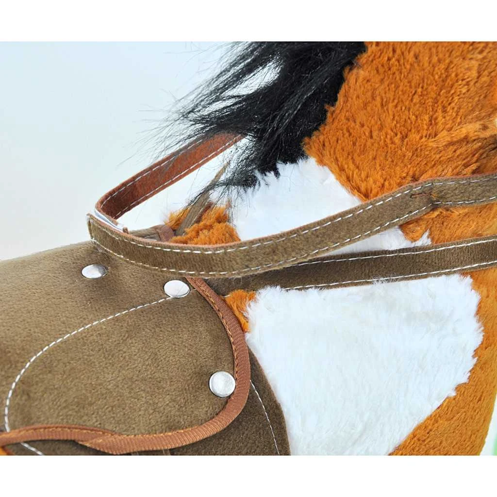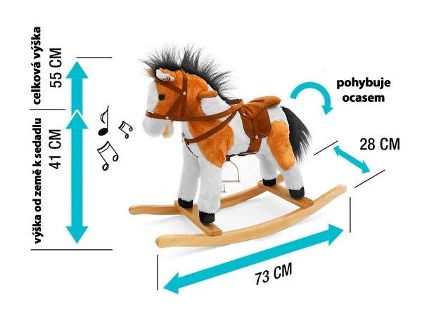 Po stlačení ušiek koník pohybuje chvostíkom aj tlamičkou a vydáva zvuky. Je vyrobený z mäkkého plyšového materiálu, vďaka čomu si Vaše dieťa môže dlho užívať skvelú zábavu. Hračka má sedlo, strmene a drevené rukoväte.