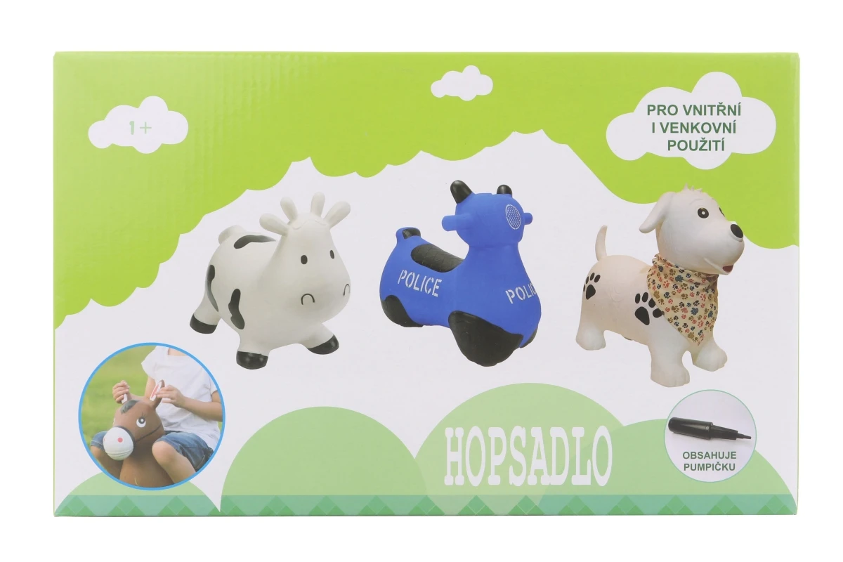 Gumové hopsadlo psík o veľkosti cca 52 x 44 x 23 cm. Výška sedátka cca 27 cm. Rozmery balenia cca 32,5 x 20 x 15 cm. Maximálna nosnosť je 50 kg. Súčasťou balenia je pumpička.