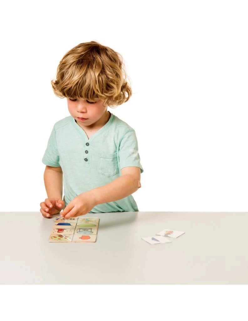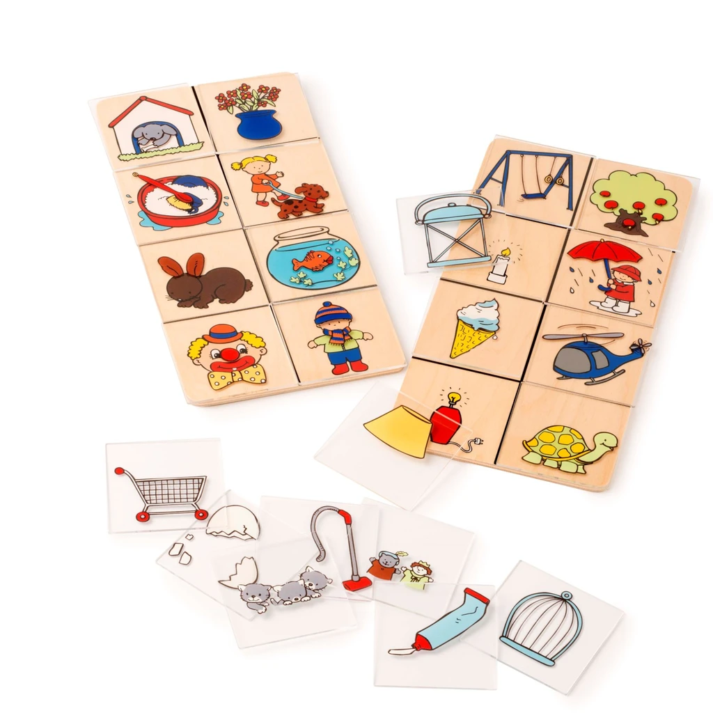 Priraďujte priehľadné kartičky k dreveným obrázkom tak, aby zodpovedali zadaniu v obrázku. Čo vidíte? Dáva výsledný obrázok zmysel? Skvelá hra na rozširovanie slovnej zásoby, logického myslenia a trpezlivosť. Premýšľajte, rozprávajte, popisujte, čo vidíte.