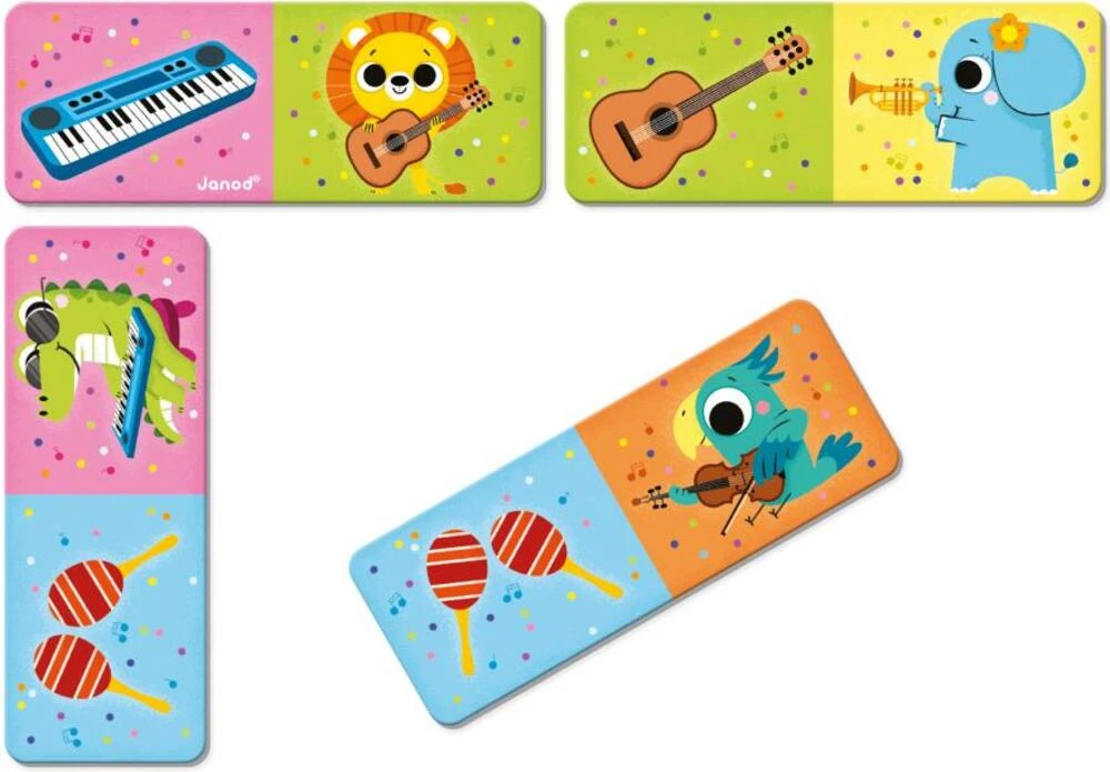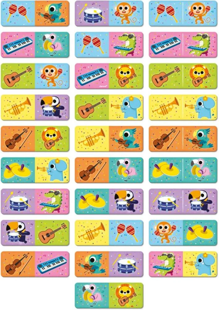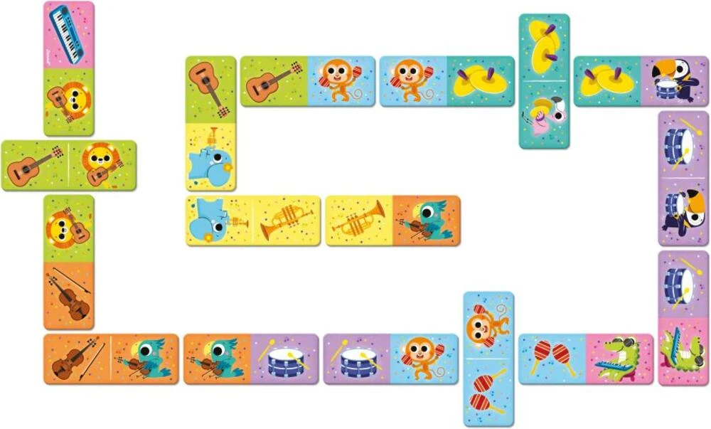 Rýchlo... kapela začala! Objavte zvieratá z džungle a ich hudobné nástroje. Táto domino hra obsahuje 28 dielikov a je zábavná a zároveň vzdelávacia. Spojte buď rovnaké zviera alebo jeho hudobný nástroj.