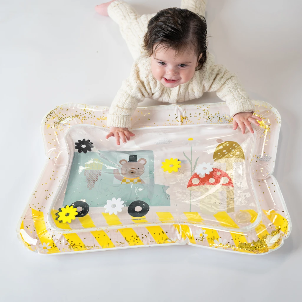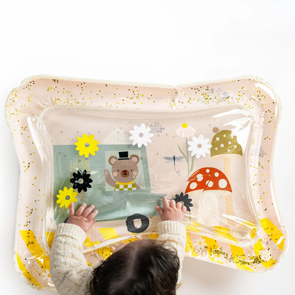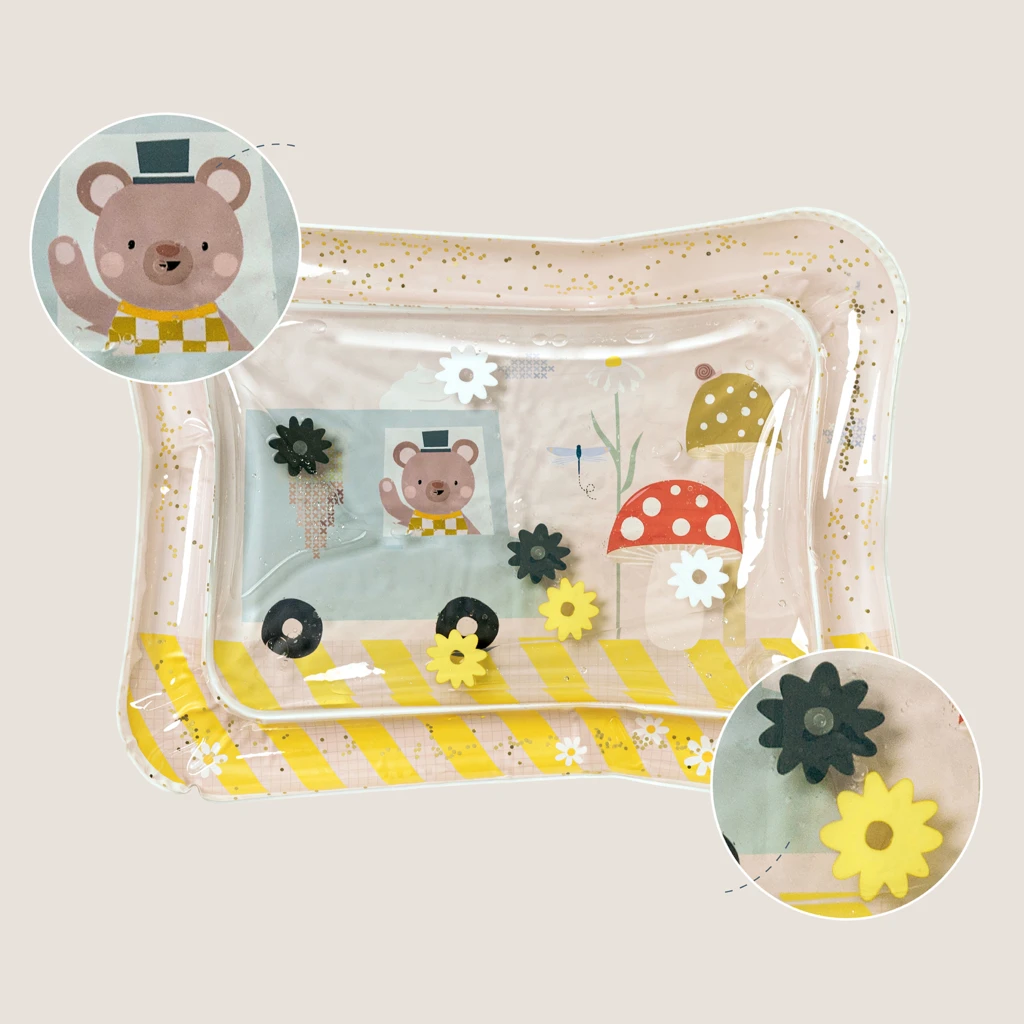 Vnútri podložky sa pohybujú farebné hračky a trblietky, ktoré podporujú zvedavosť a dlhšie sústredenie