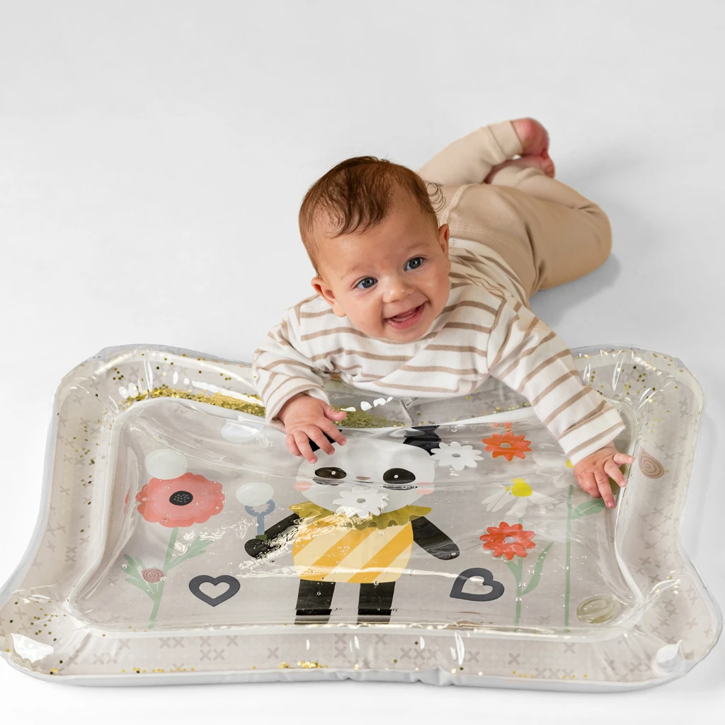 Vnútri podložky sa pohybujú farebné hračky a trblietky, ktoré podporujú zvedavosť a dlhšie sústredenie