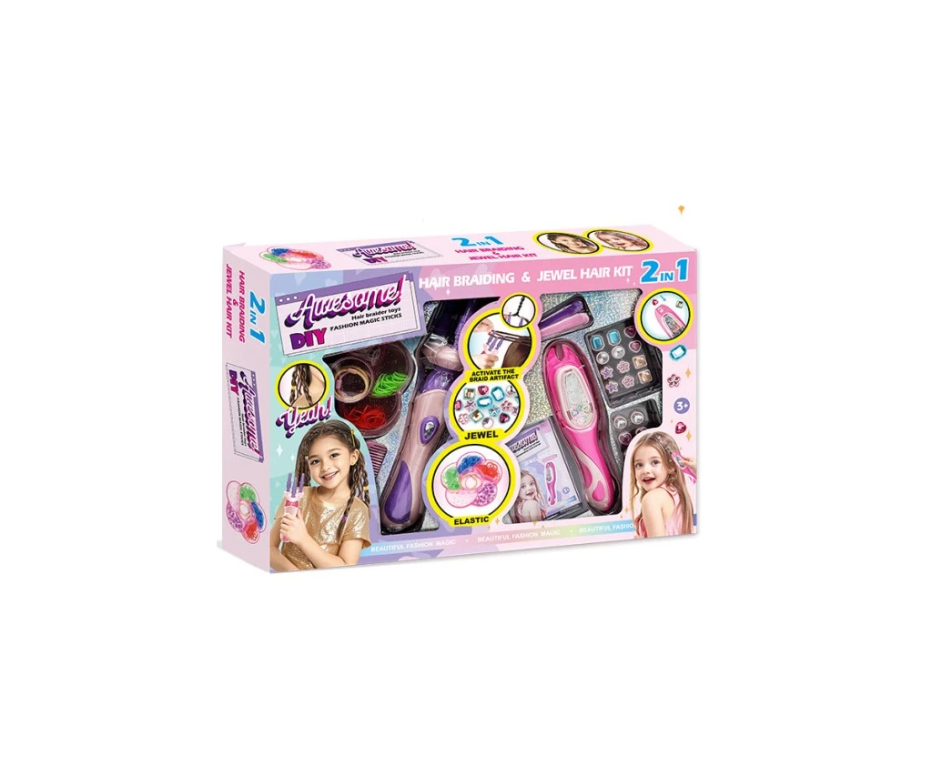 Hrací set na vlasy 2v1 s gumičkami a ozdobami je určený pre malé parádnice od troch rokov, ktoré si chcú samy vytvárať originálne a štýlové účesy. Set obsahuje nielen farebné doplnky na ozdobenie vlasov, ale aj nástroje pre ľahké zapletanie. V balení nájdete dva hlavné prístroje – jeden slúži na zaplietanie vlasov pomocou troch rotujúcich tyčiniek, druhý je určený na pripevňovanie rôznych ozdôb a gumičiek do vlasov. Oba prístroje majú ružovo-fialovú farebnú kombináciu, ktorá je atraktívna pre malé deti.