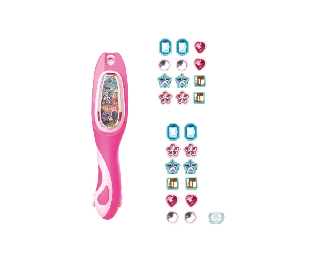 Súčasťou balenia je aj ružový aplikátor s ergonomickým tvarom, ktorý umožňuje jednoduchú a bezpečnú inštaláciu ozdôb do vlasov. Aplikátor má priehľadné okienko, v ktorom sú viditeľné drobné farebné korálky, čo dodáva výrobku atraktívny vizuálny prvok. Vďaka tomuto nástroju môžu deti jednoducho pripevniť dekorácie bez potreby lepidiel či zložitých pomôcok, čo zaručuje pohodlné a čisté používanie.