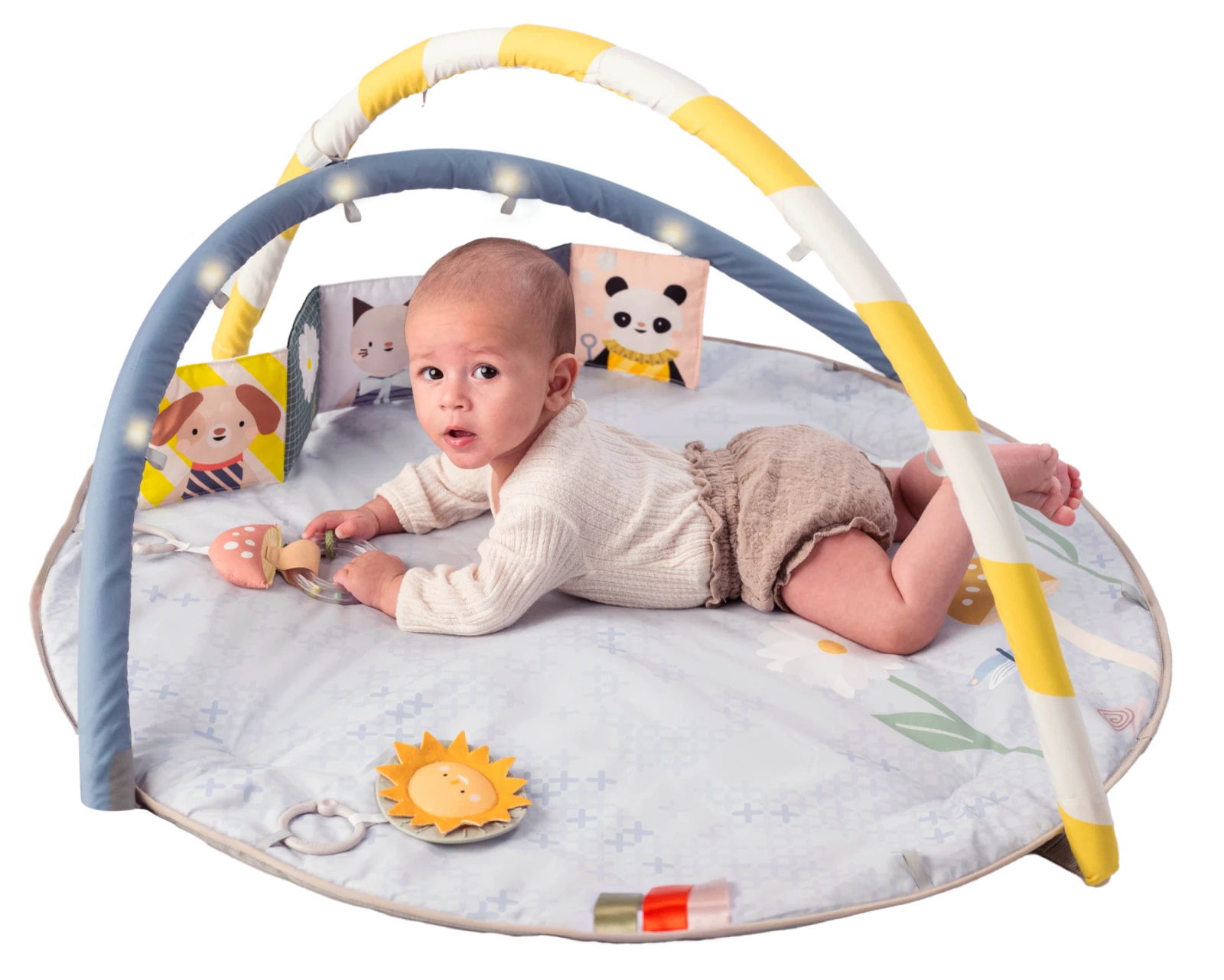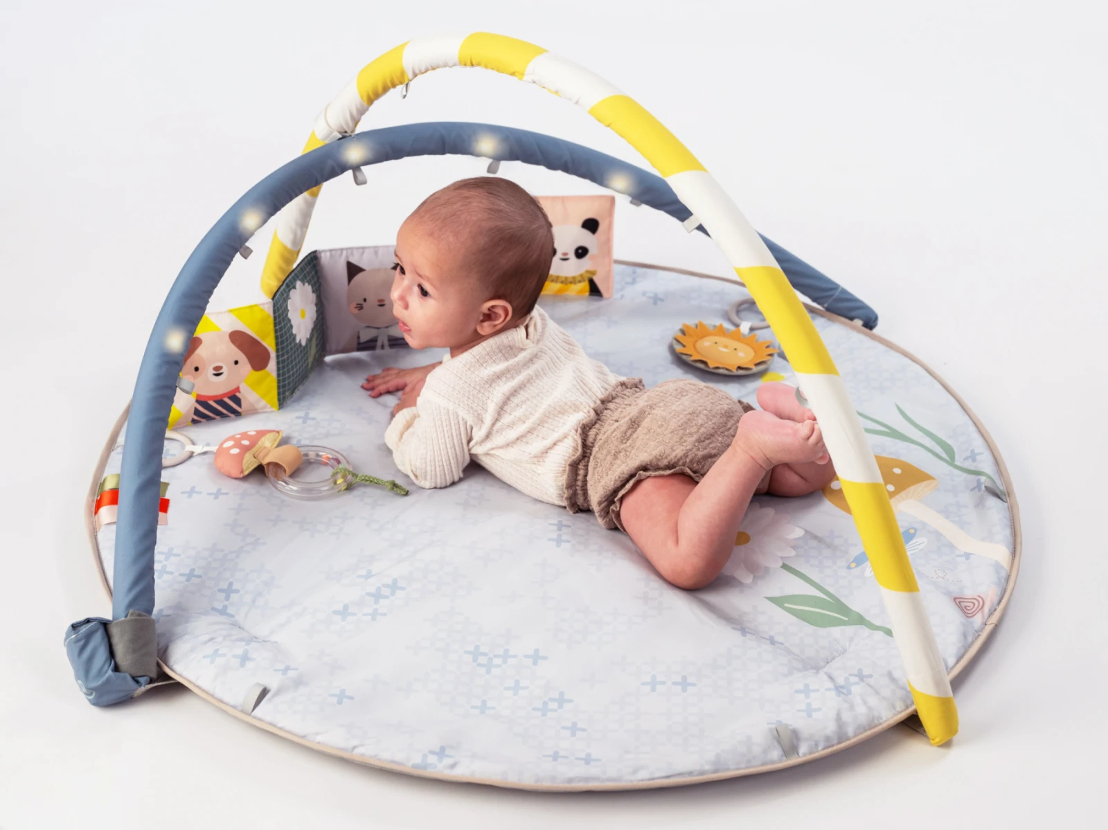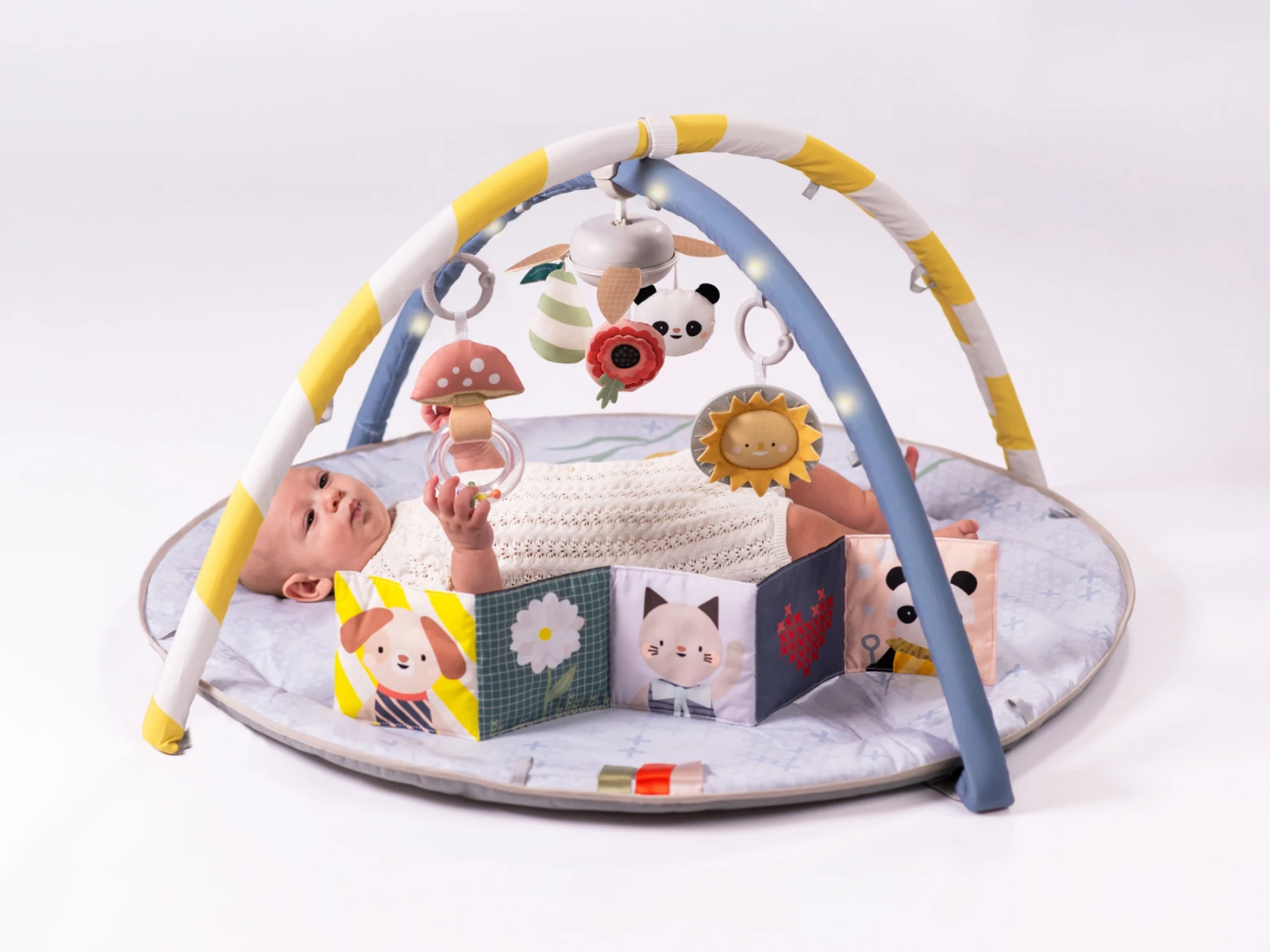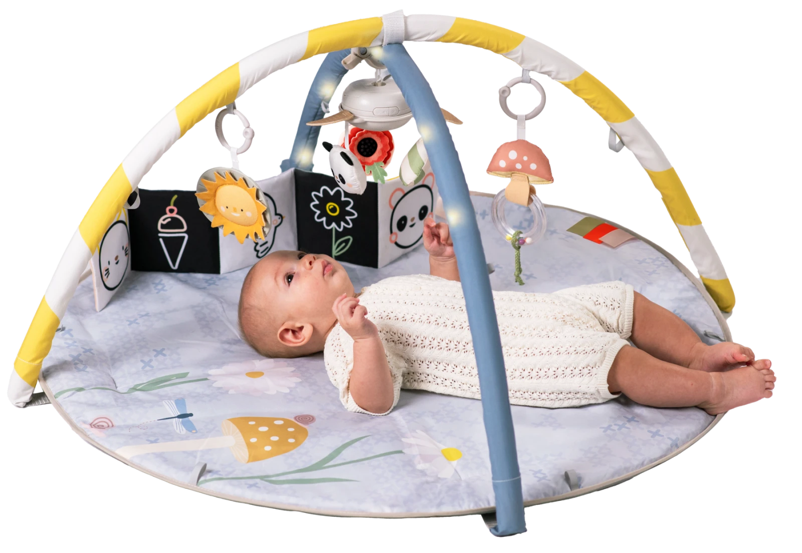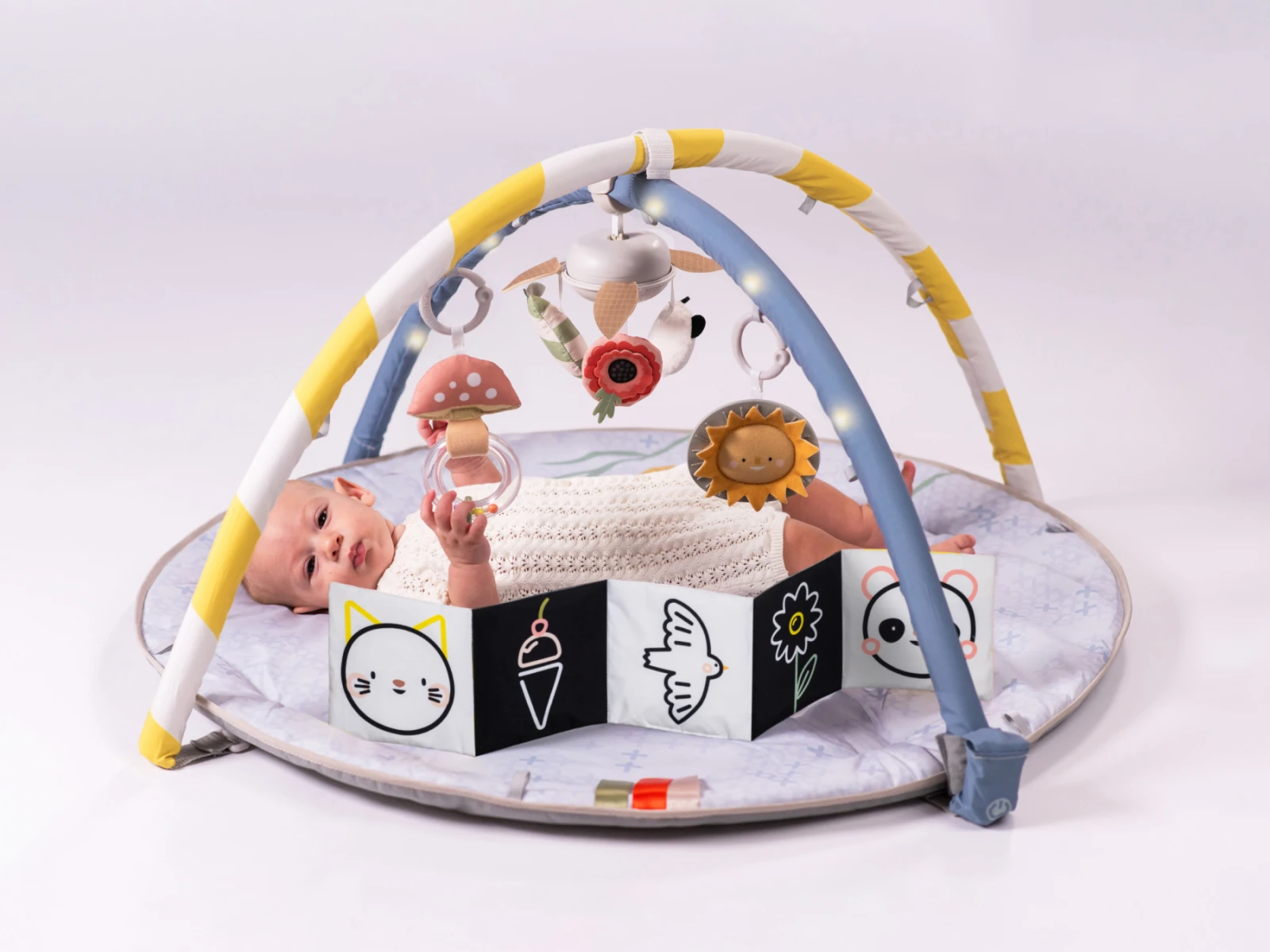 Prečo si ju zamilujete: Odnímateľný hudobný kolotoč s melódiami (22 minút) - upokojujúca hudba podporuje sluchovú stimuláciu a vytvára atmosféru pre hranie aj relaxáciu. Nastaviteľné oblúky hrazdy s LED svetielkami - pohyblivé svetelné body pomáhajú rozvíjať zrak a sledovanie pohybu očami (vizuálny tracking). Všestranné hračky - hrkálka v tvare huby, slniečko s hryzátkom a obojstranná šuštiaca knižka (čiernobiela a farebná) rozvíja hmat aj zrak podľa veku dieťaťa. Polstrovaná hracia podložka - mäkká a bezpečná na ležanie aj prvé pokusy o pretáčanie či lezenie, knižka a stužky navyše motivujú k aktivite na brušku. Prispôsobenie deky podľa veku dieťaťa - možnosť úprav podľa vývojovej fázy dieťaťa od novorodencov až po zvedavé batoľatá.