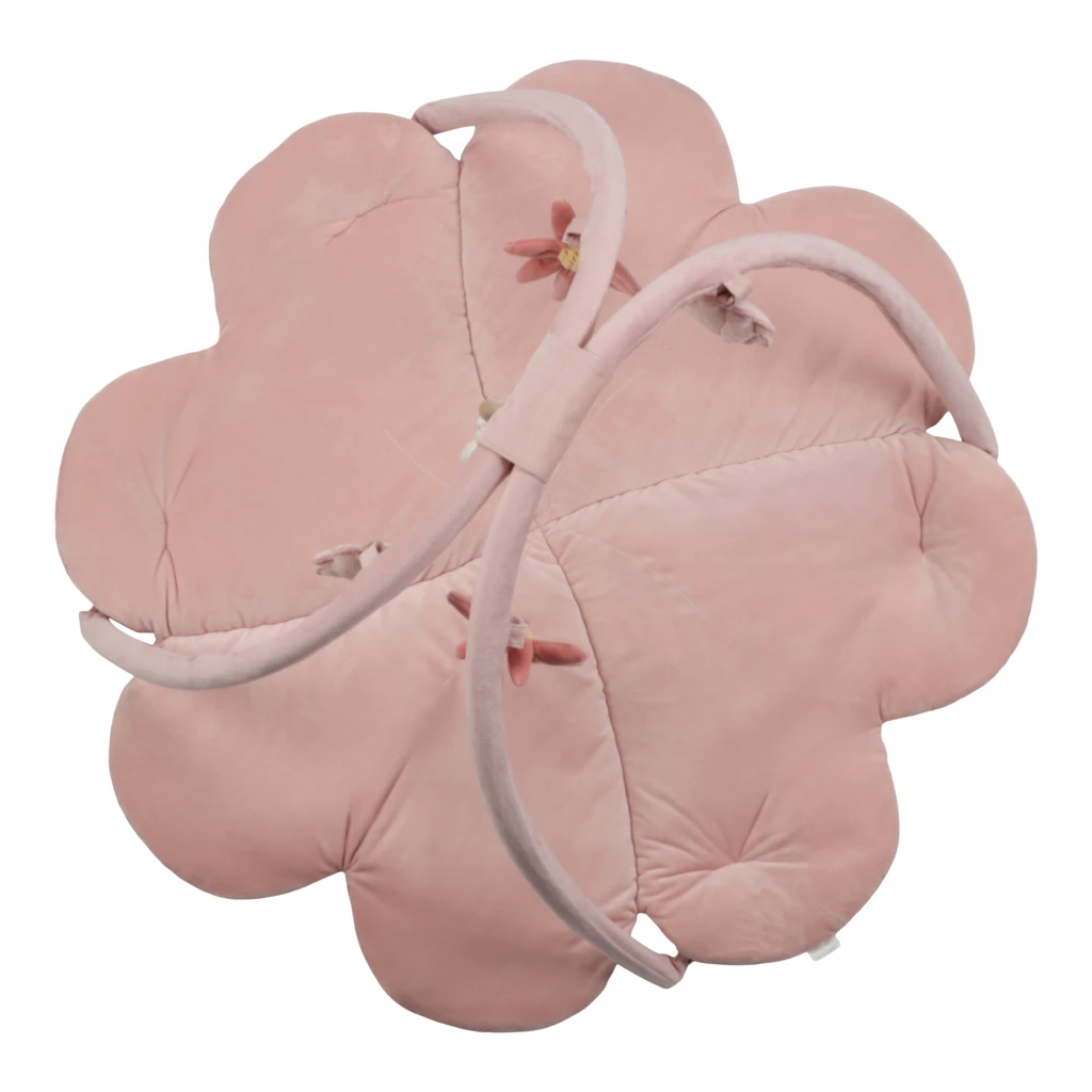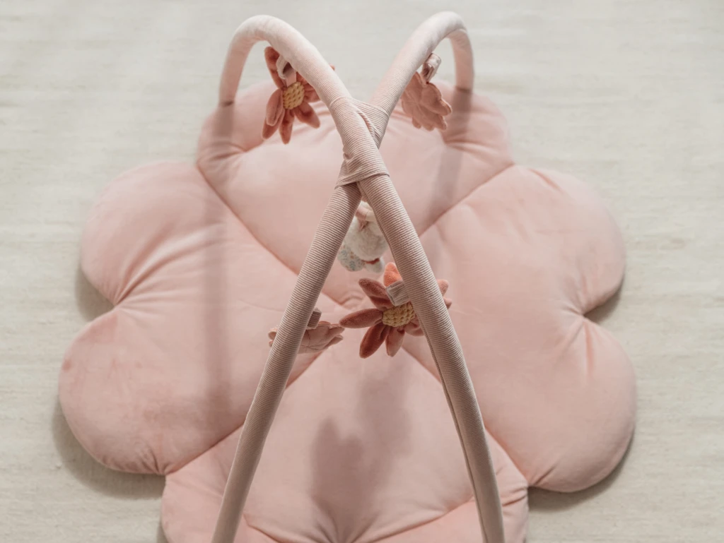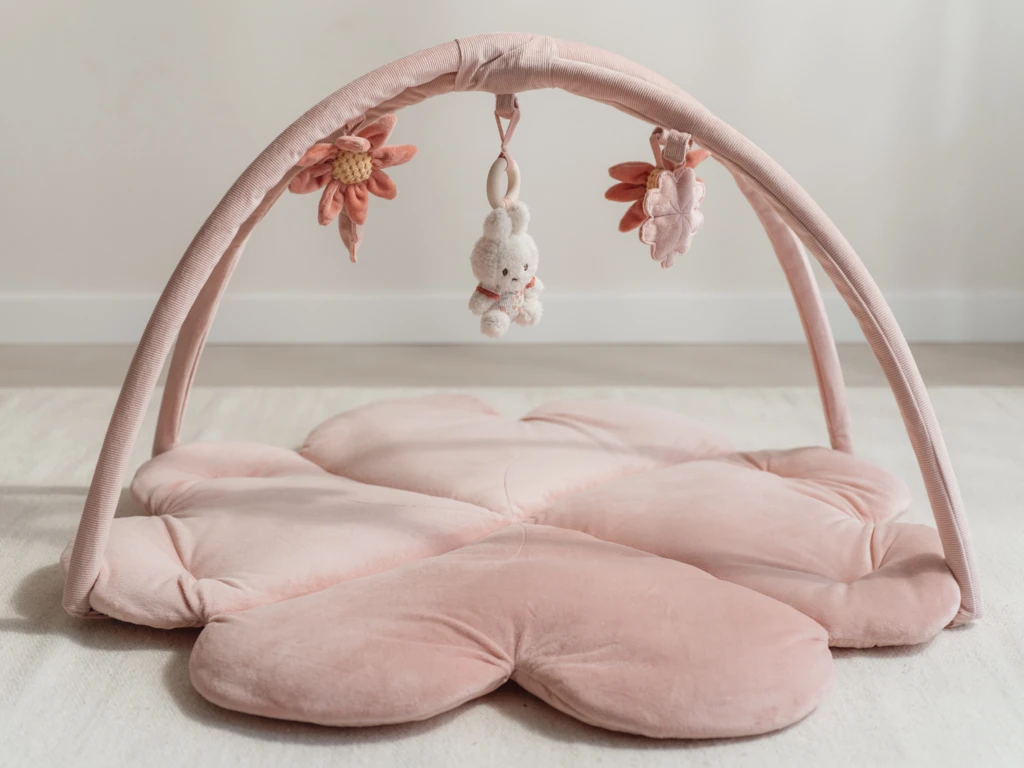 Mäkká hracia deka v tvare štvorlístka s hrazdou, na ktorej sú zavesené hračky v podobe zajačika Miffy, kvietkov a lístkov.