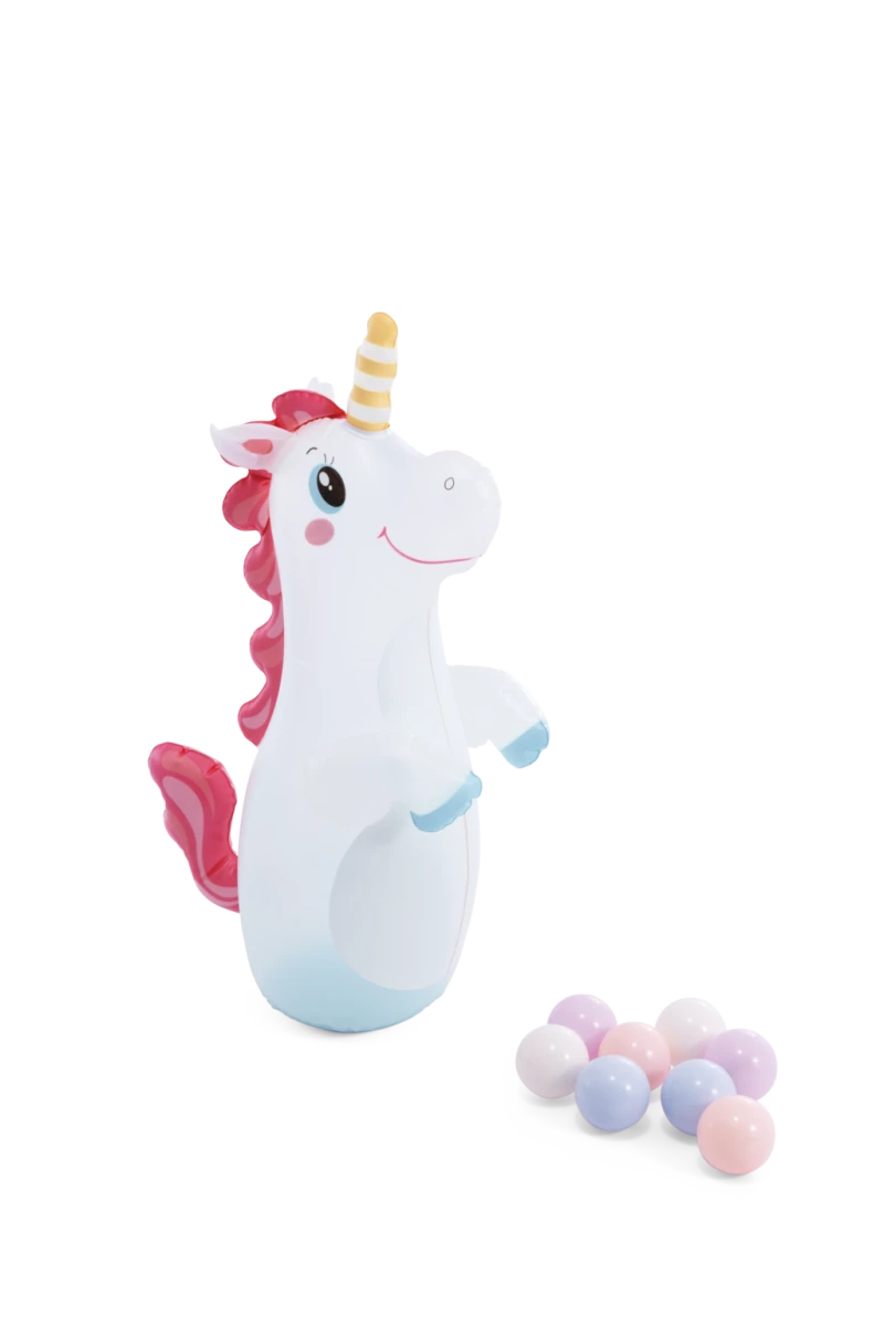 K hracím prvkom patrí aj nafukovací boxovací panák v tvare jednorožca s ružovou hrivou a žltým rohom, ktorý deti môže pobaviť aktívnou hrou. K dispozícii je osem farebných loptičiek, ktoré je možné použiť na prehadzovanie cez obruč umiestnenú na oblúku hradu, čím sa rozvíja motorické schopnosti a koordinácia. Celkové prevedenie je z kvalitného PVC materiálu s hladkým povrchom, ktorý je ľahko umývateľný.