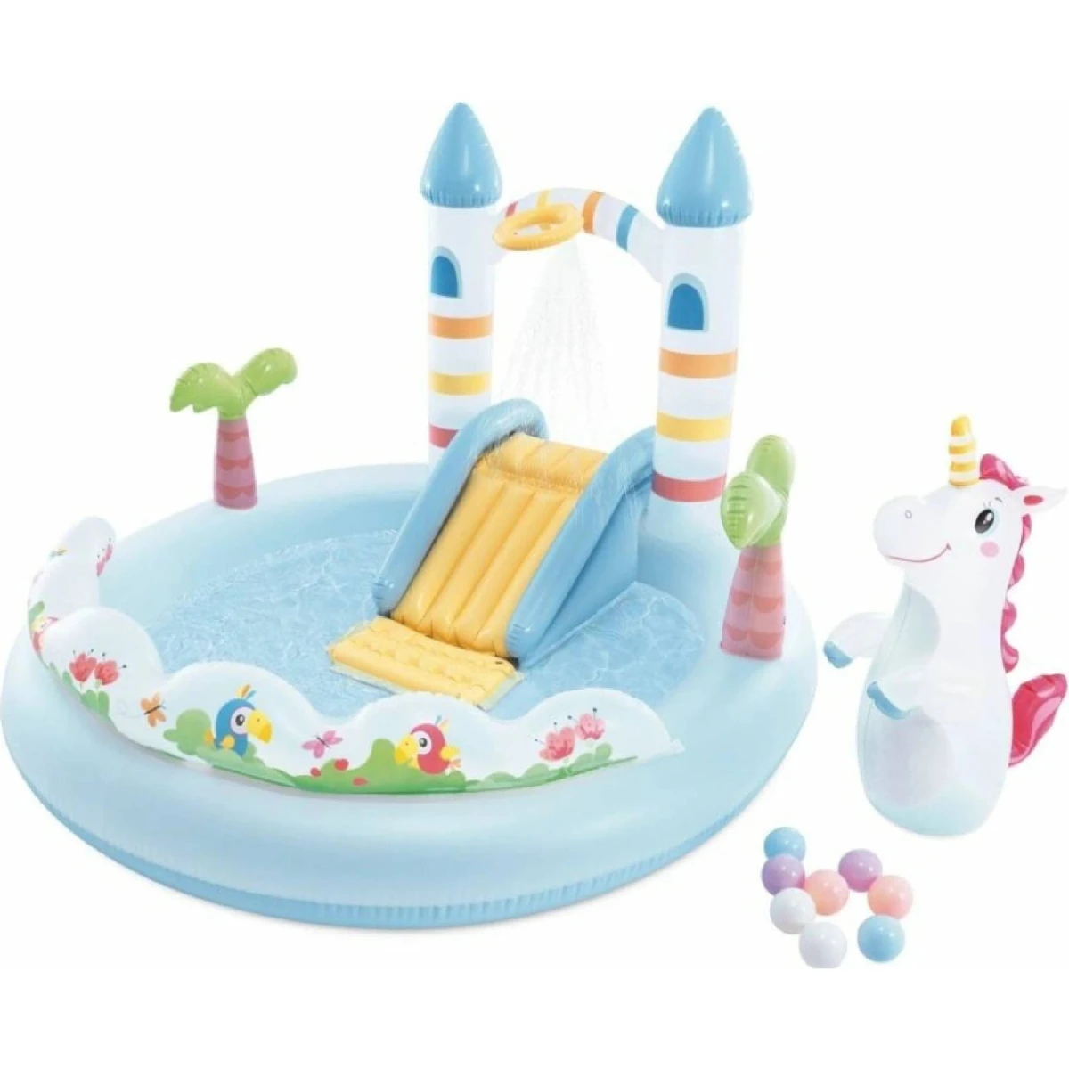 Hracie centrum Jednorožčí hrad je nafukovací herný set určený pre deti od dvoch rokov, ktorý kombinuje zábavu s možnosťou osvieženia v horúcich letných dňoch.