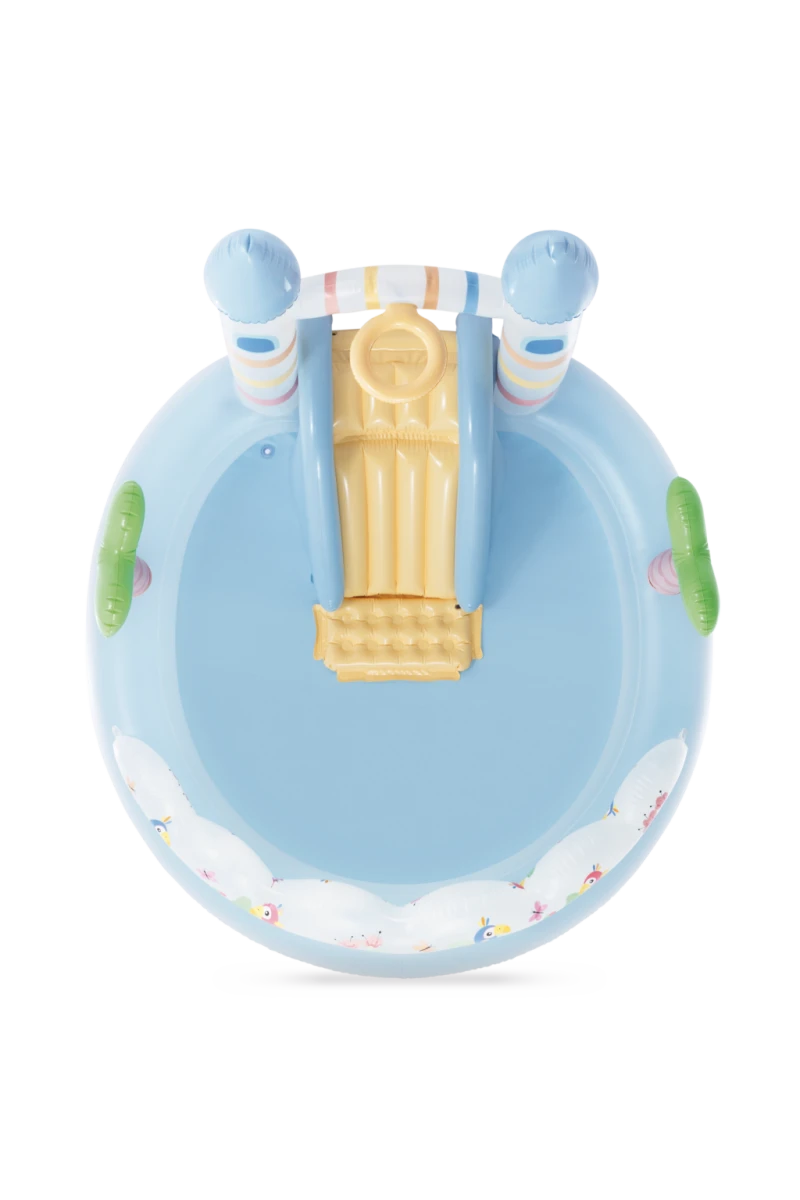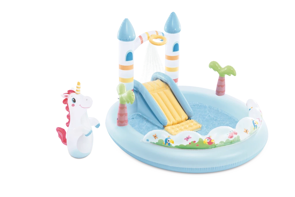 Hracie centrum Jednorožčí hrad je nafukovací herný set určený pre deti od dvoch rokov, ktorý kombinuje zábavu s možnosťou osvieženia v horúcich letných dňoch. Je navrhnutý v jemných pastelových farbách s motívom kúzelného hradu a doplnený veselými ilustráciami vtáčikov, motýľov a obláčikov, ktoré prispievajú k rozprávkovej atmosfére. Dominantou hracieho centra je šmykľavka v žltej farbe, ktorá je opatrená extra polstrovaním na dojazdovej ploche, čo zaisťuje bezpečný a pohodlný sklz.