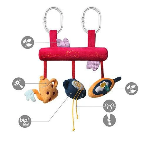 Vzdelávacia hračka zoznámi vaše dieťa s rozmanitým svetom farieb, zvukov a tvarov. Tvar hračky v podobe hrazdičky umožňuje zavesenie na všetky druhy autosedačiek alebo kočíkov. Vďaka tomu môže dieťa sprevádzať počas cestovania a prechádzok.