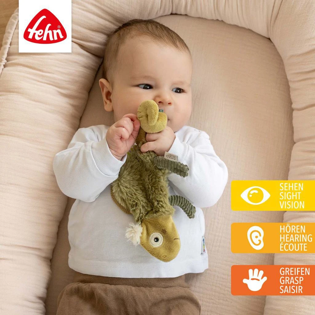 Malý šuštivý chameleón z kolekcie Lazy, Crazy & Pink hravo stimuluje detský sluch, hmat aj úchop. Vďaka rôznorodým materiálom a zaujímavým zvukom skrytého šuštivého papiera sa nikdy neomrzí. Bábätká milujú tvar roztomilého chameleóna, ktorého môžu uchopiť, dotýkať sa ho, objavovať a maznať sa s ním! Hebký chameleón je ideálnym spoločníkom pre deti pri hraní i snívaní a možno ho vziať kamkoľvek so sebou.