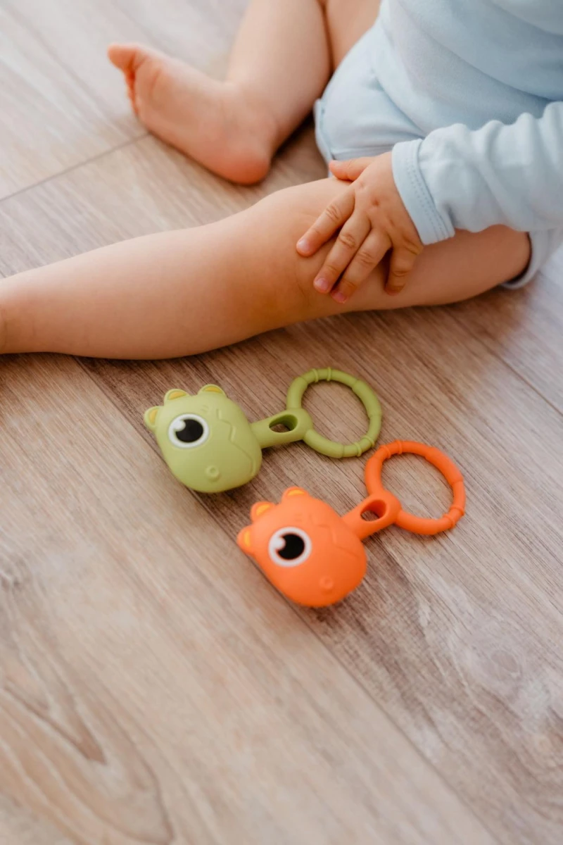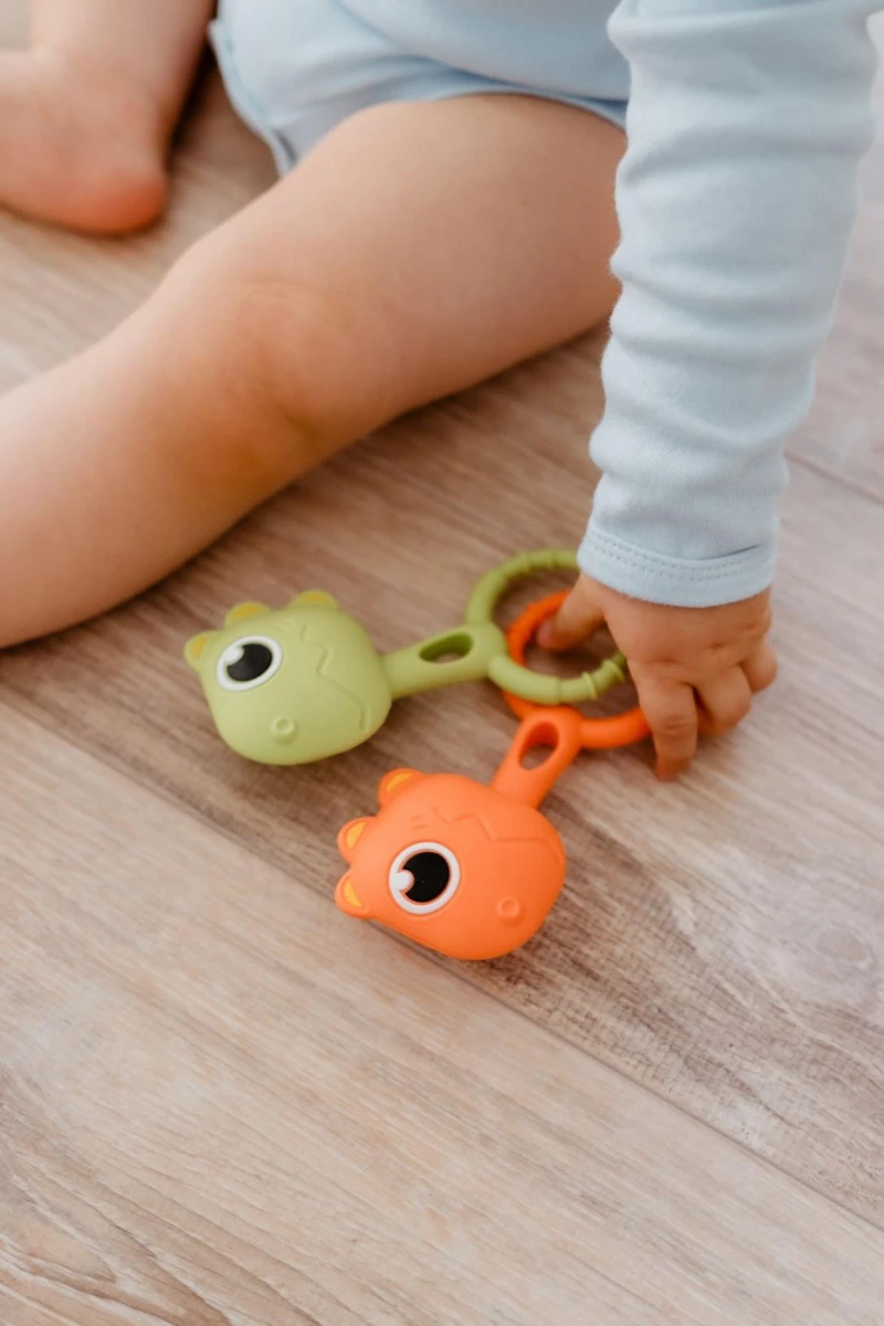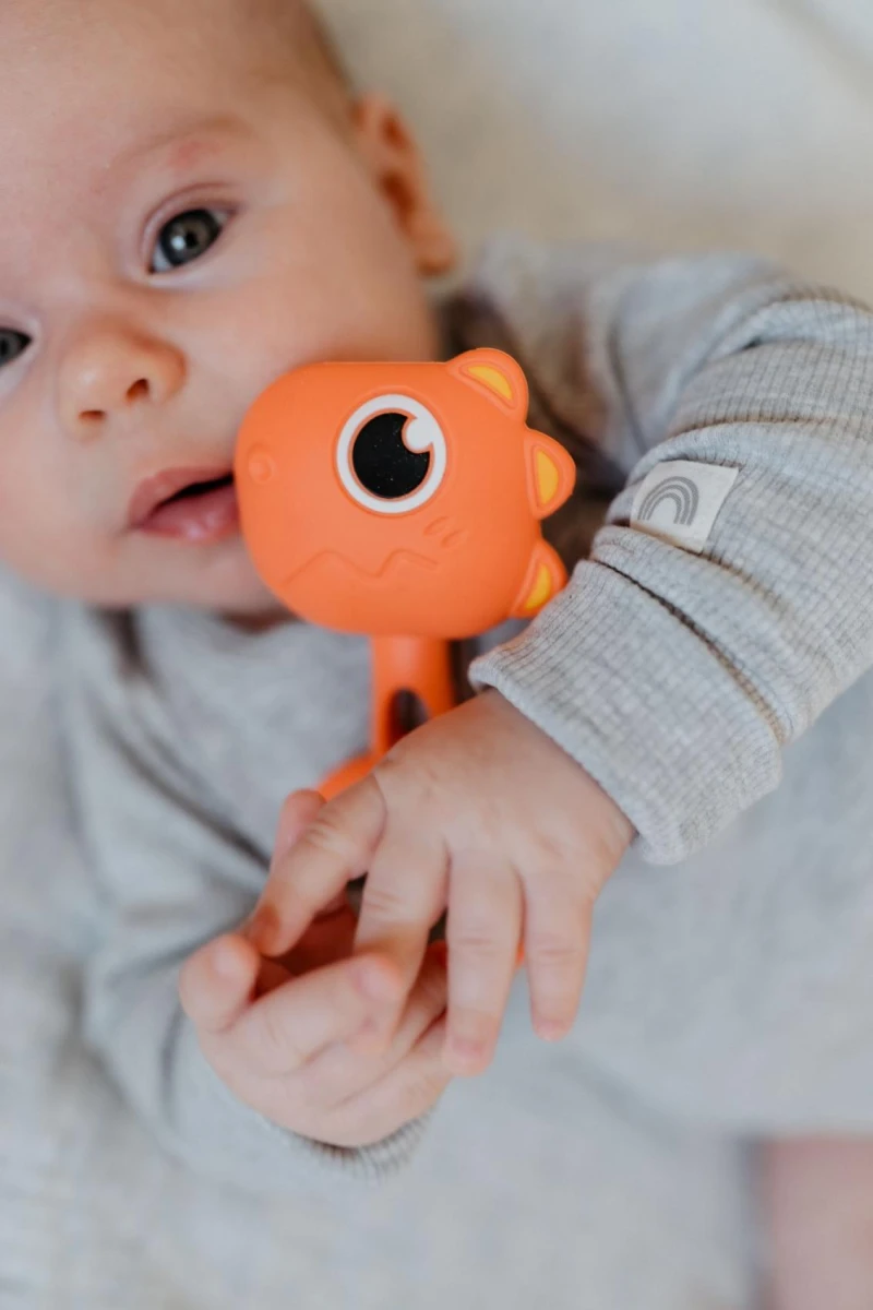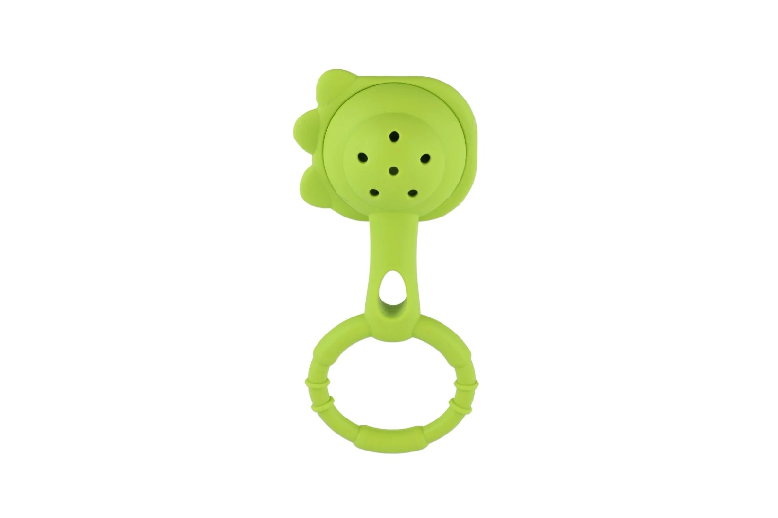 Mäkký silikónový materiál je príjemný na dotyk a vhodný aj pri prerezávaní prvých zúbkov. Ergonomický tvar s krúžkom umožňuje ľahké držanie a podporuje rozvoj jemnej motoriky aj koordinácie ruky a oka. Jemné chrastenie stimuluje sluchové vnímanie dieťaťa.