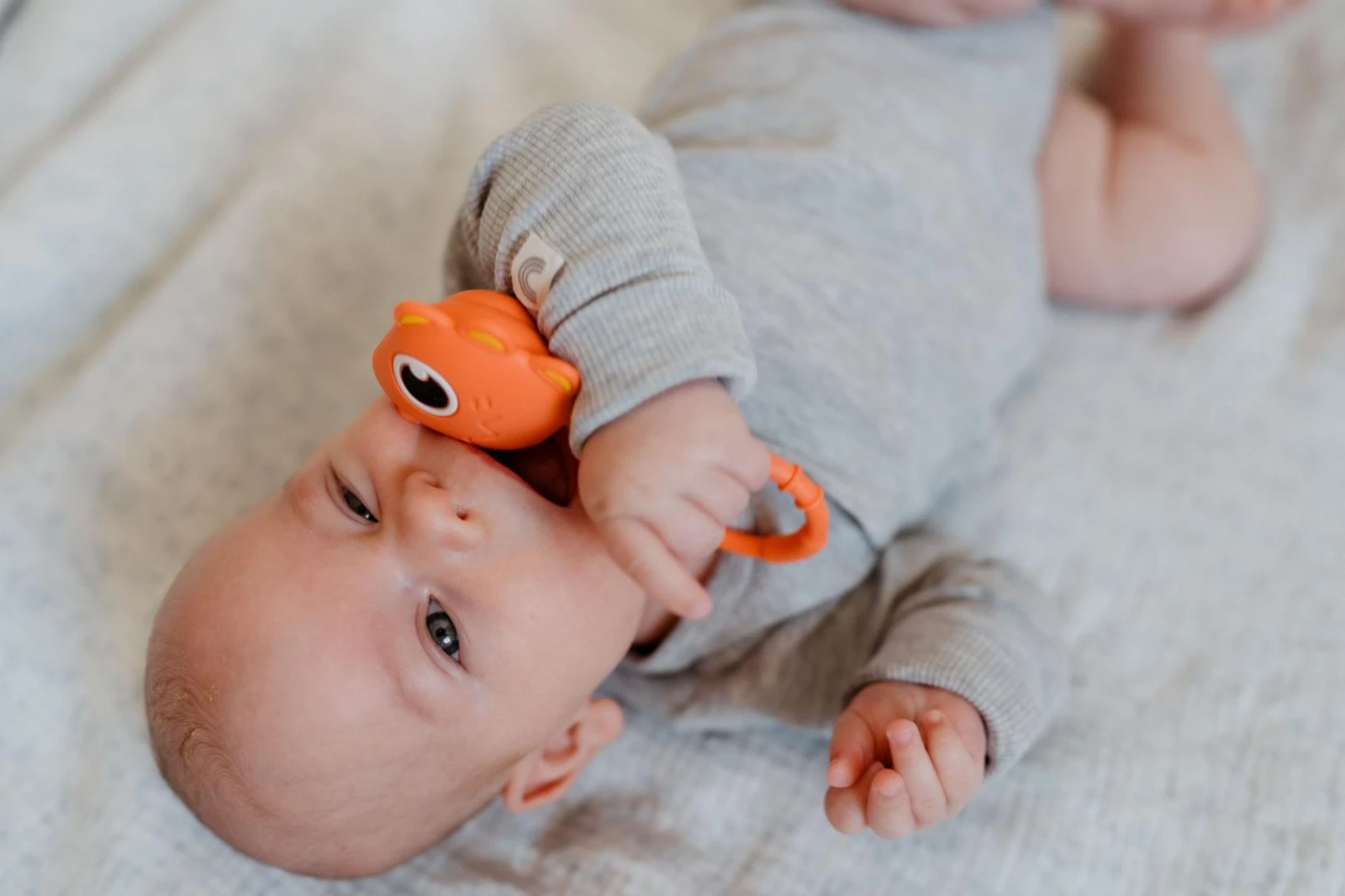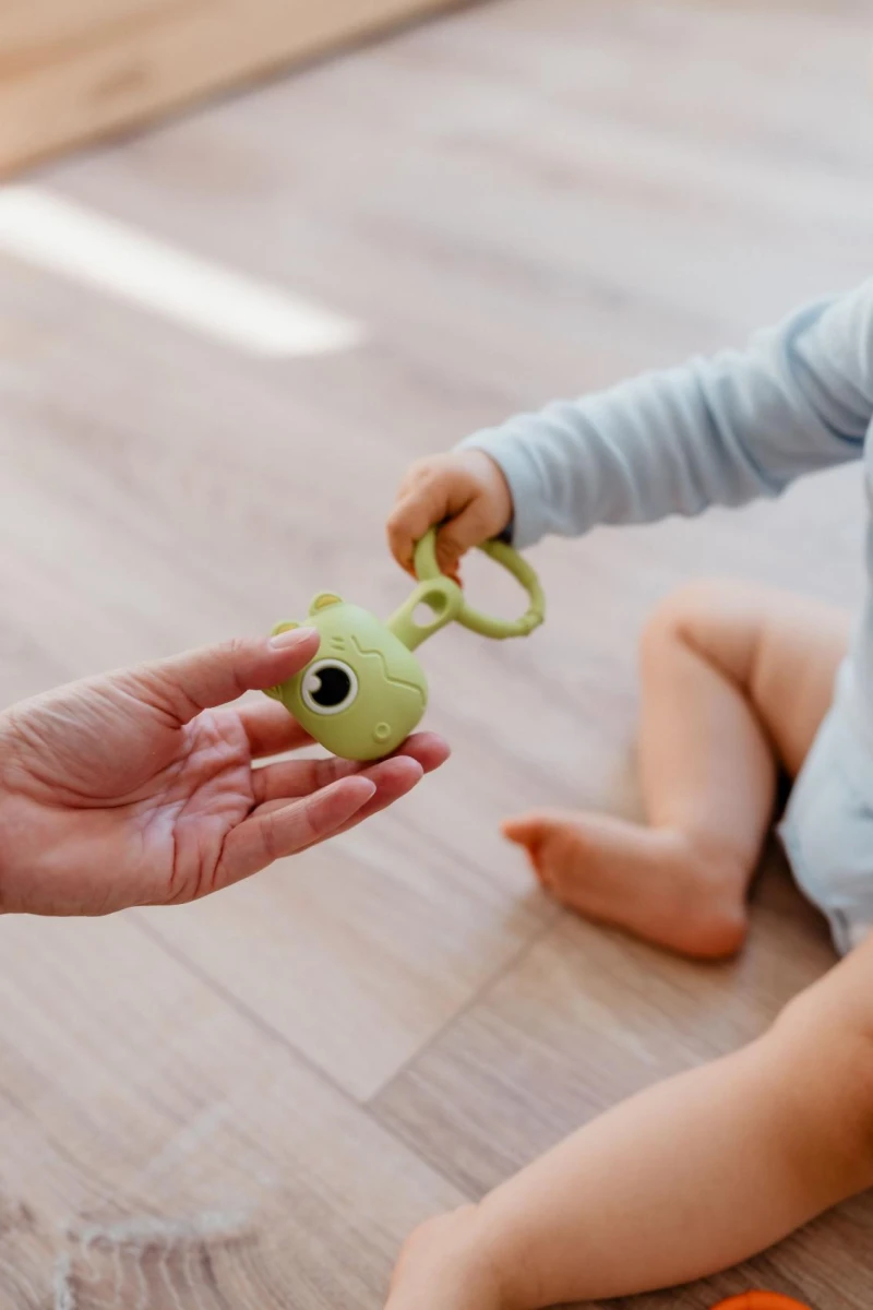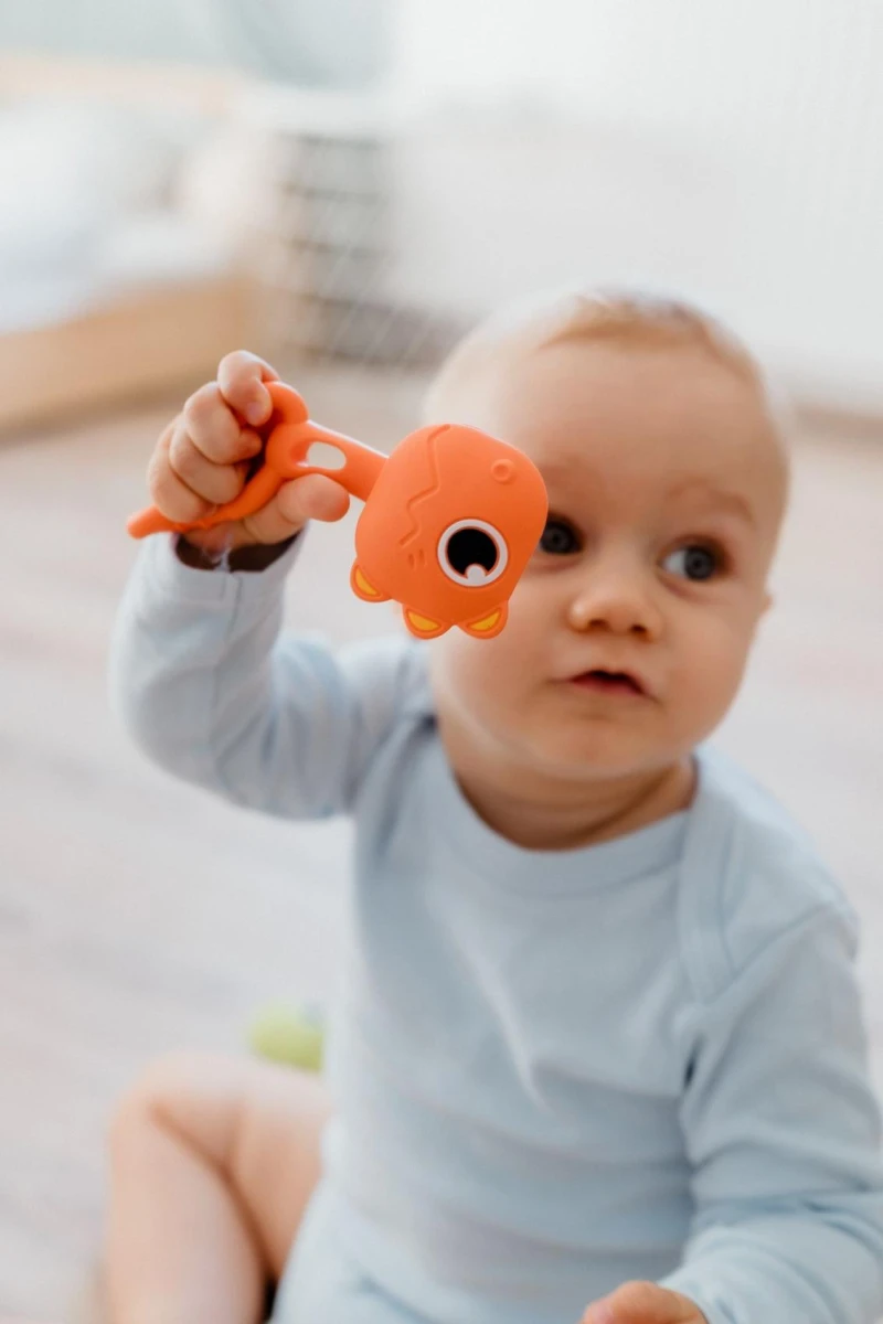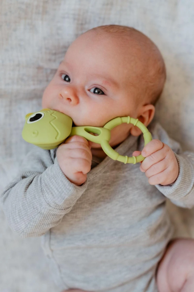 Mäkký silikónový materiál je príjemný na dotyk a vhodný aj pri prerezávaní prvých zúbkov. Ergonomický tvar s krúžkom umožňuje ľahké držanie a podporuje rozvoj jemnej motoriky aj koordinácie ruky a oka. Jemné chrastenie stimuluje sluchové vnímanie dieťaťa.