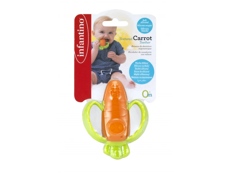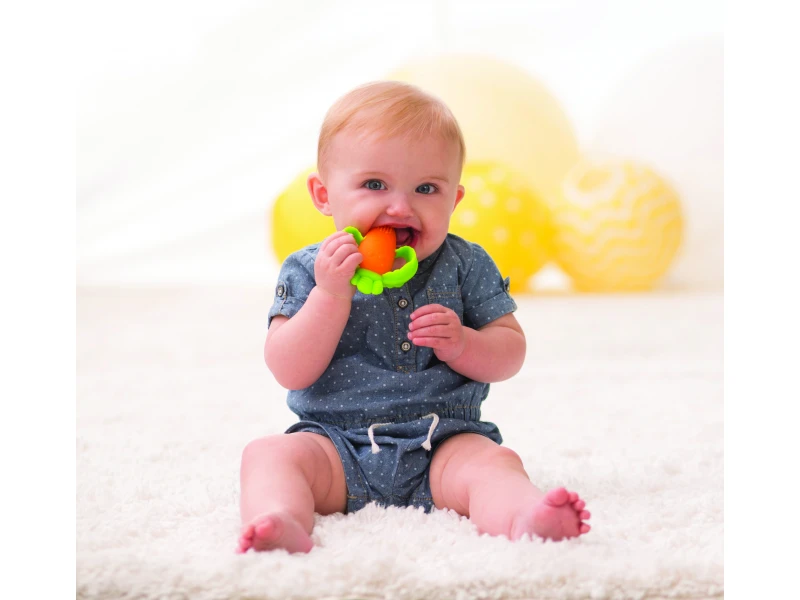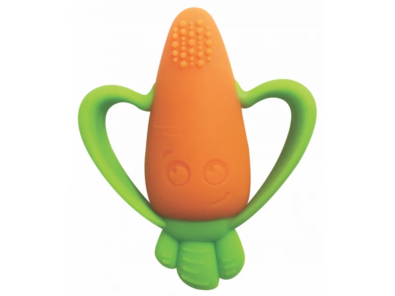 Rozkošné hryzátko v podobe usmievavej mrkvičky je vyrobené z pružného mäkkého silikónu. Rôznorodé textúry lákajú dieťa na skúmanie v ústach, masírovaním ďasien hryzátko pomáha dieťaťu pri prerezávaní prvých zúbkov.