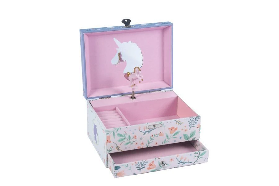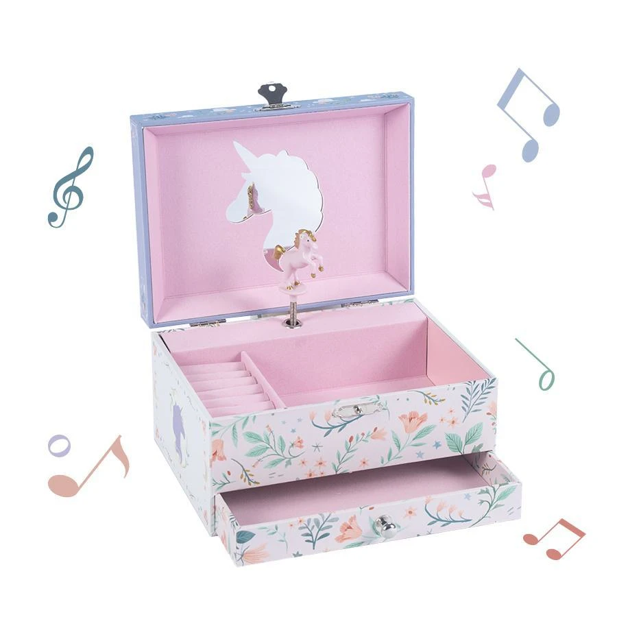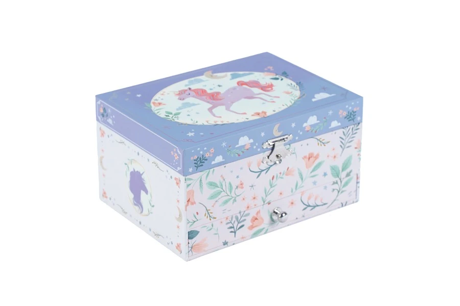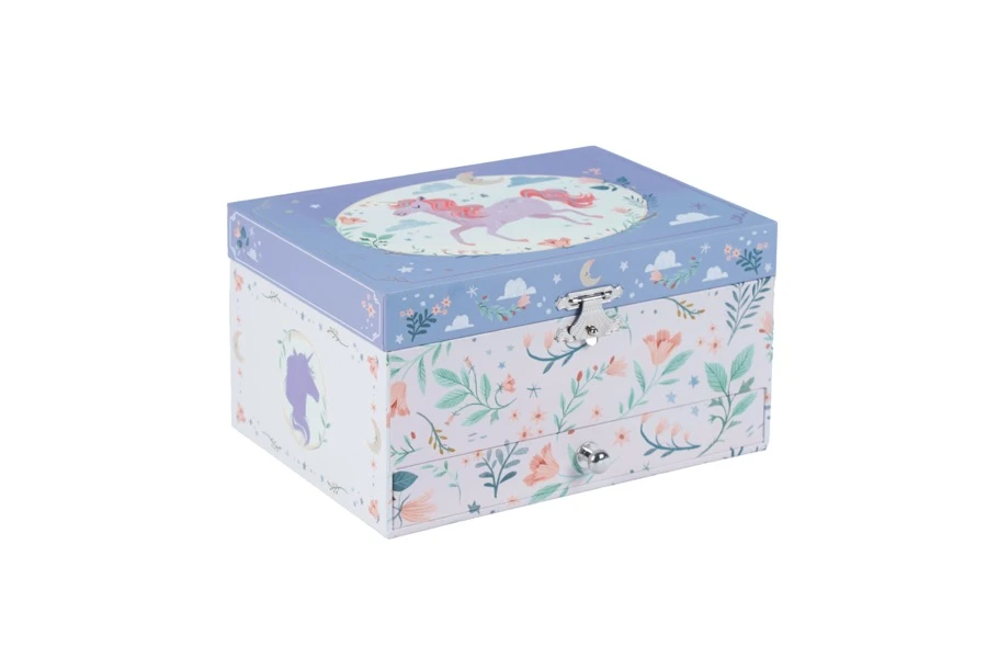 Hracia skrinka s jednorožcom, ktorý sa točí. Skrinka po otvorení hrá a jednorožec sa točí. Vyrobené z tvrdého odolného papiera.